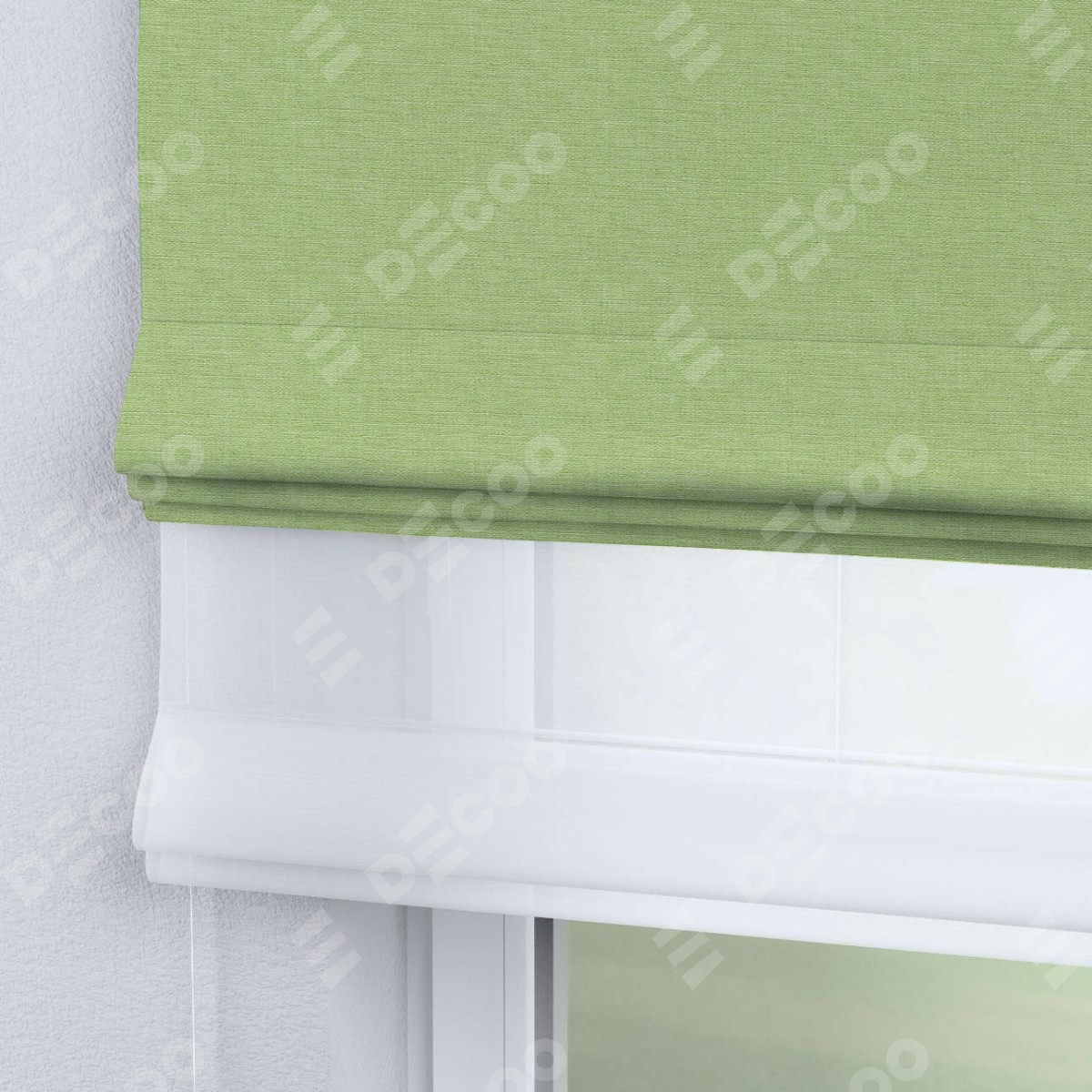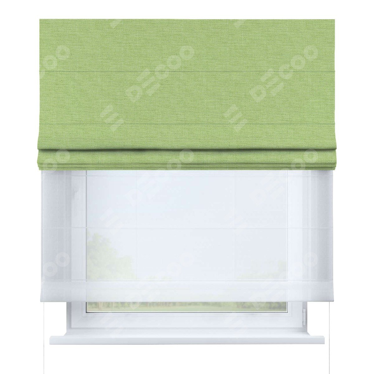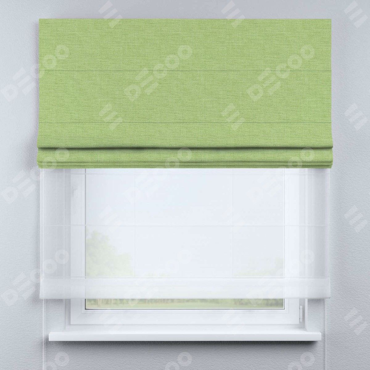 Римская штора день-ночь производителя «Cortin», используется для проёма, пошита из двух полотен, с лицевой стороны лён зелёный артикул 85906, вторая ткань тюль (по стандарту комплектуется тюль белого цвета артикул V-01). Имеет универсальный механизм и подходит для монтажа: на потолок, на стену и в нишу.