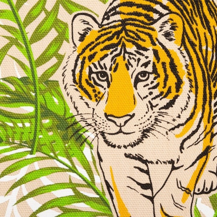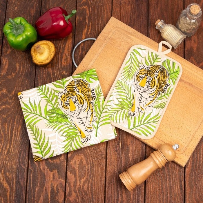 Кухонный набор Тигр в листьях (полотенце 39×60+прихватка 14,5×22), беж, хлопок 100%, 200г/м2