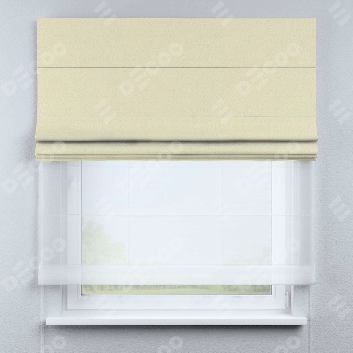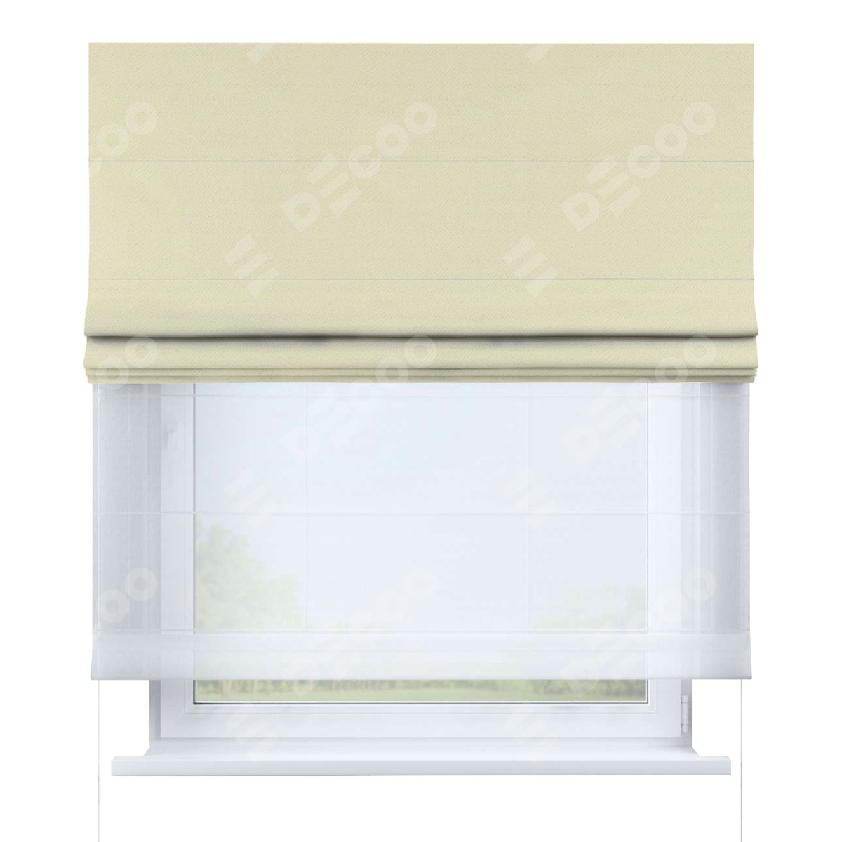 Римская штора день-ночь производителя «Cortin», используется для проёма, пошита из двух полотен, с лицевой стороны блэкаут однотонный бежевый артикул 88283, вторая ткань тюль (по стандарту комплектуется тюль белого цвета артикул V-01). Имеет универсальный механизм и подходит для монтажа: на потолок, на стену и в нишу.