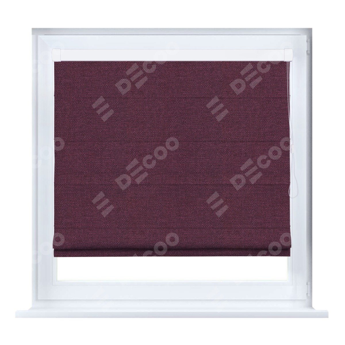Римская штора кассетного типа, производителя «Cortin», устанавливается только на пластиковые окна и прилегает к стеклопакету, пошита из ткани лён фиолетовый, артикул 85907.