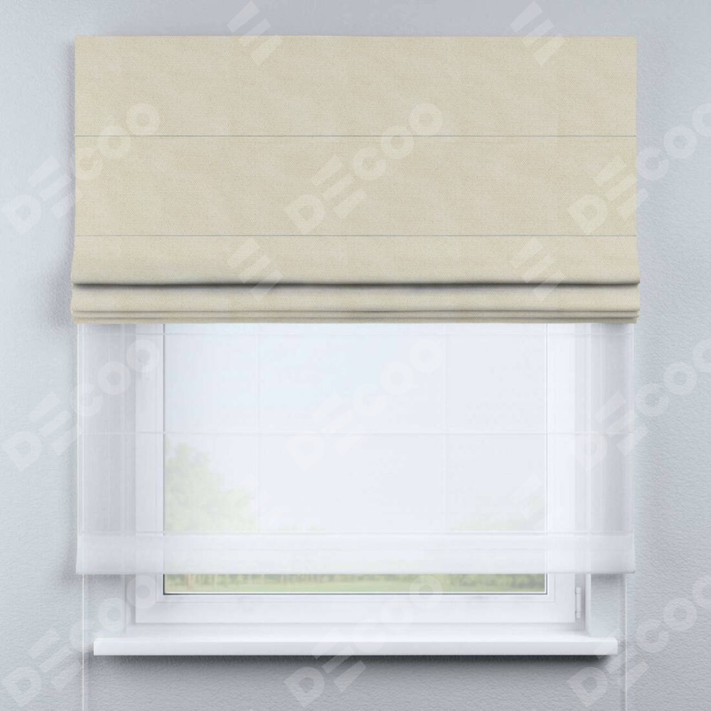 Римская штора день-ночь производителя «Cortin», используется для проёма, пошита из двух полотен, с лицевой стороны лён димаут бежевый артикул 83023, вторая ткань тюль (по стандарту комплектуется тюль белого цвета артикул V-01). Имеет универсальный механизм и подходит для монтажа: на потолок, на стену и в нишу.