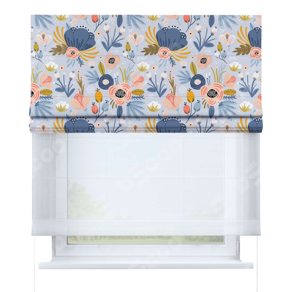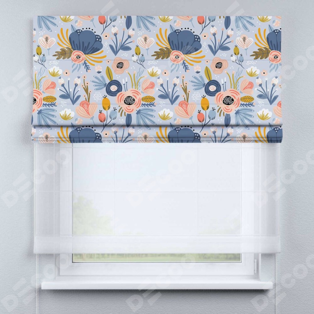 Римская штора день-ночь производителя «Cortin», используется для проёма, пошита из двух полотен, с лицевой блэкаут с нанесением сублимационной печати «Волшебные цветы», вторая ткань тюль (по стандарту комплектуется тюль белого цвета артикул V-01). Имеет универсальный механизм и подходит для монтажа: на потолок, на стену и в нишу.