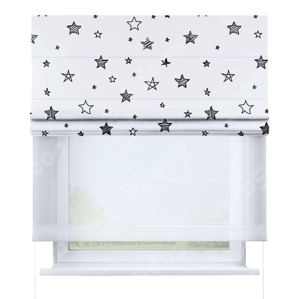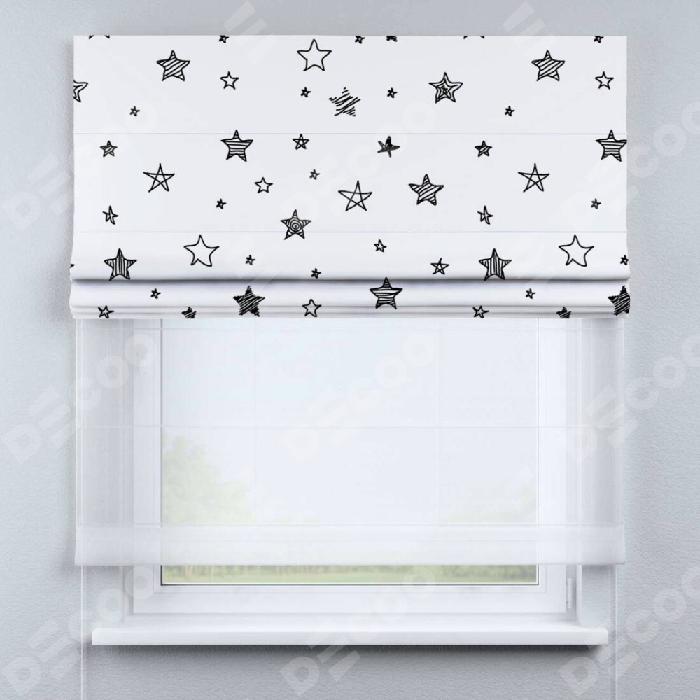 Римская штора день-ночь производителя «Cortin», используется для проёма, пошита из двух полотен, с лицевой блэкаут с нанесением сублимационной печати «Звёзды», вторая ткань тюль (по стандарту комплектуется тюль белого цвета артикул V-01). Имеет универсальный механизм и подходит для монтажа: на потолок, на стену и в нишу.