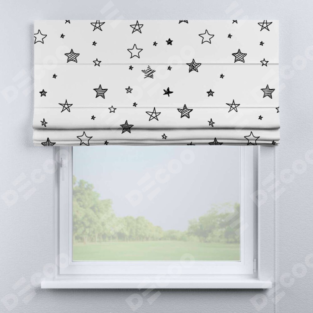 Римская штора производителя «Cortin», используется для проёма, пошита из ткани блэкаут с нанесением сублимационной печати «Звёзды». Имеет универсальный механизм и подходит для монтажа: на потолок, на стену и в нишу.