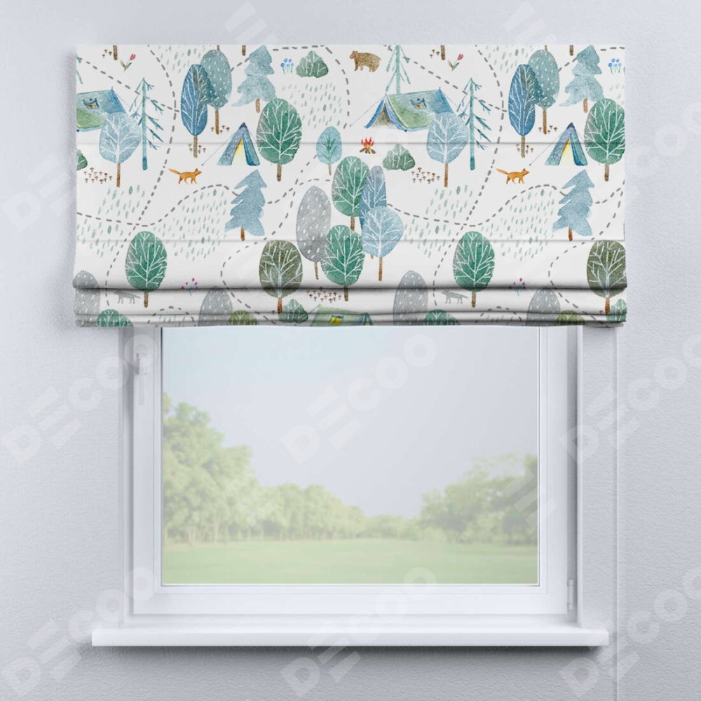 Римская штора производителя «Cortin», используется для проёма, пошита из ткани блэкаут с нанесением сублимационной печати «Лесистая местность». Имеет универсальный механизм и подходит для монтажа: на потолок, на стену и в нишу.