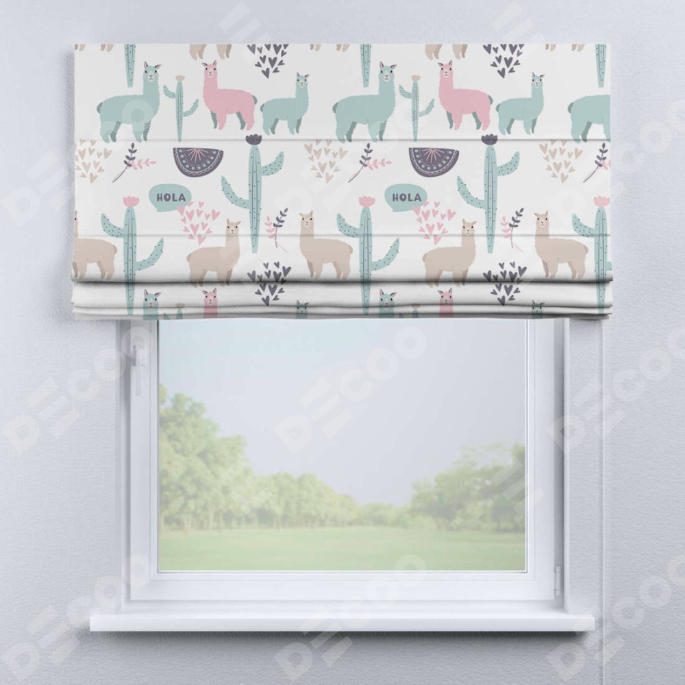 Римская штора производителя «Cortin», используется для проёма, пошита из ткани блэкаут с нанесением сублимационной печати «Милый лама». Имеет универсальный механизм и подходит для монтажа: на потолок, на стену и в нишу.
