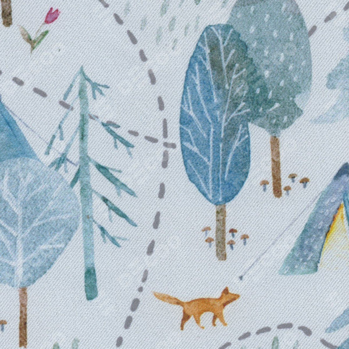 Римская штора кассетного типа, производителя «Cortin», устанавливается только на пластиковые окна и прилегает к стеклопакету, пошита из ткани блэкаут с нанесением сублимационной печати «Лесистая местность».