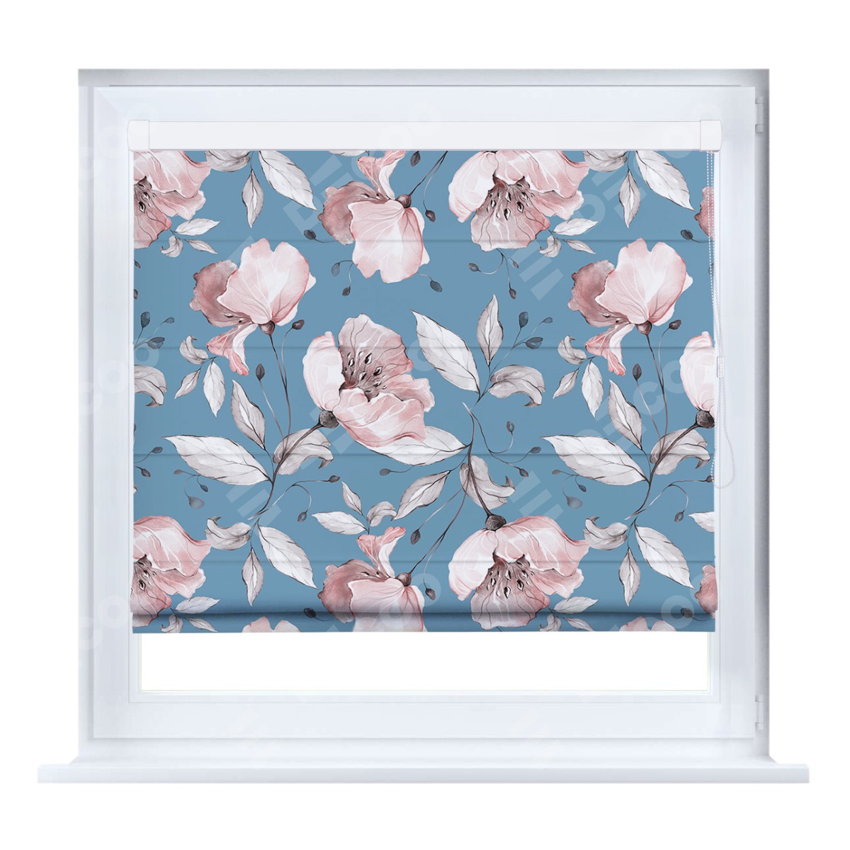 Римская штора кассетного типа, производителя «Cortin», устанавливается только на пластиковые окна и прилегает к стеклопакету, пошита из ткани блэкаут с нанесением сублимационной печати «Розовая лагуна».