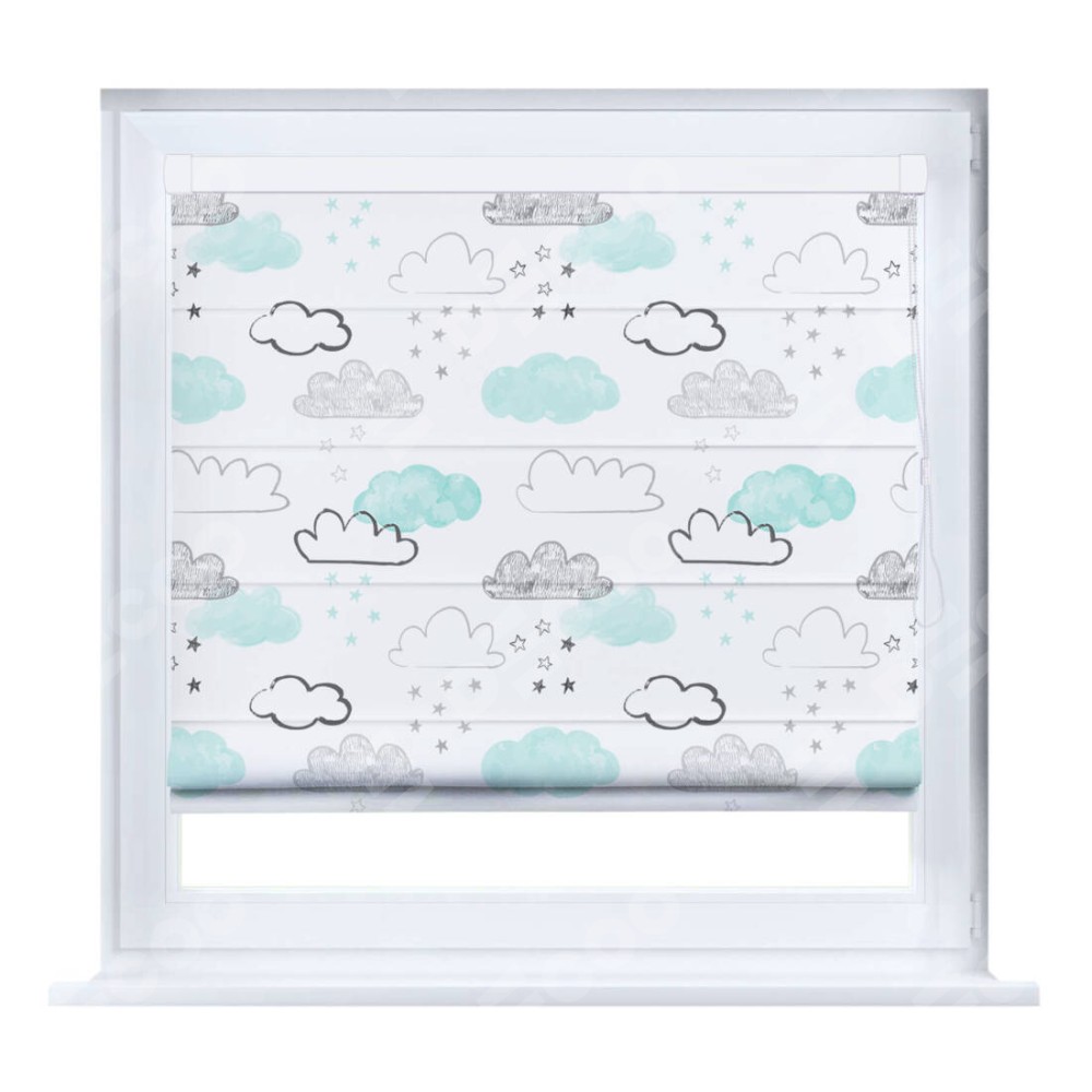 Римская штора производителя «Cortin», устанавливается на створку окна, пошита из ткани блэкаут с нанесением сублимационной печати «Облака и звёзды». Штора шьётся по индивидуальным размерам, для данного типа римской шторы возможная ширина от 35 до 150 см., высота до 250 см.