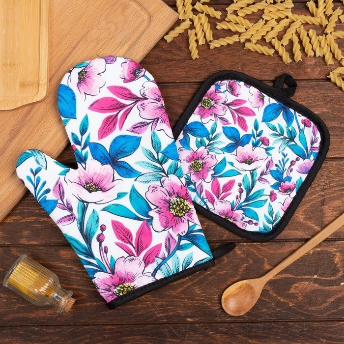 Кухонный набор (2 предмета) Этель «Цветы», прихватка 17×17 см, варежка 26×16 см, 100% п/э