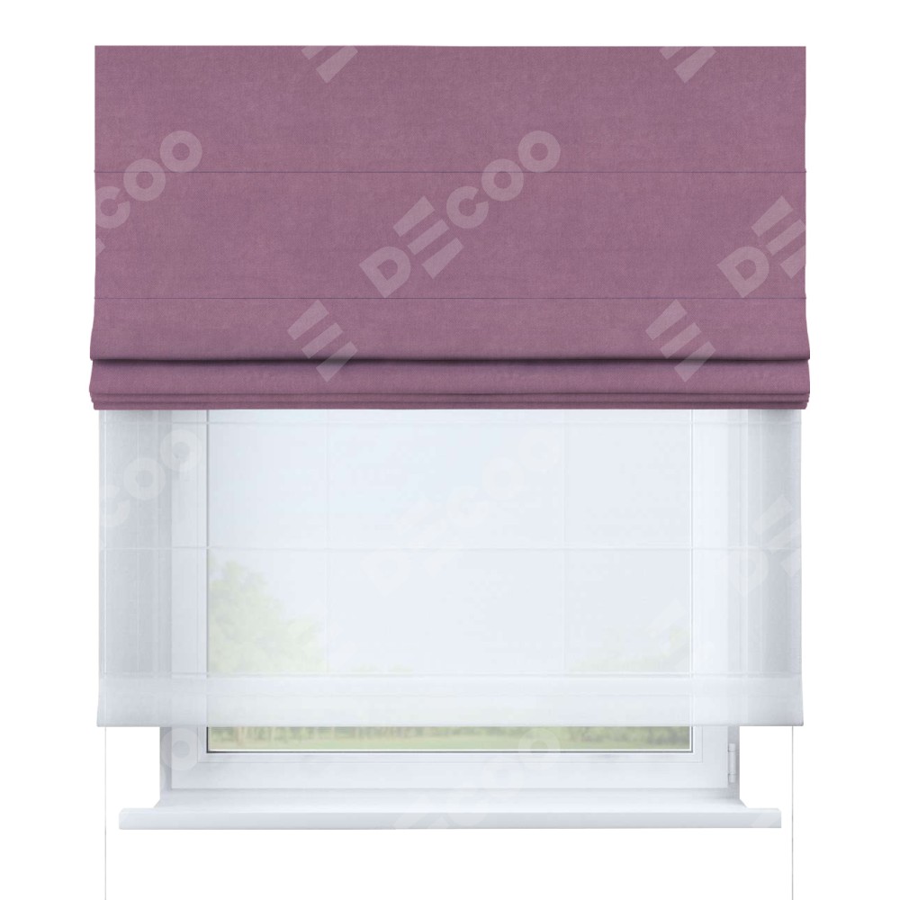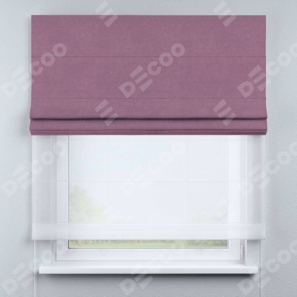 Римская штора день-ночь производителя «Cortin», используется для проёма, пошита из двух полотен, с лицевой стороны вельвет лиловый артикул 17752, вторая ткань тюль (по стандарту комплектуется тюль белого цвета артикул V-01). Имеет универсальный механизм и подходит для монтажа: на потолок, на стену и в нишу.