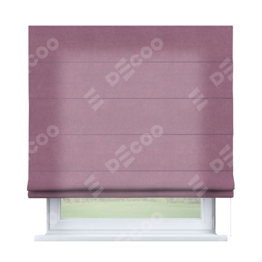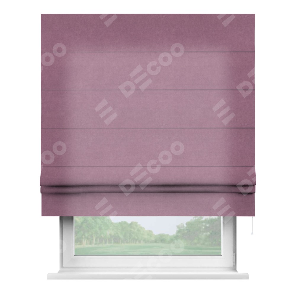 Римская штора производителя «Cortin», используется для проёма, пошита из ткани вельвет лиловый, артикул ткани 17752. Имеет универсальный механизм и подходит для монтажа: на потолок, на стену и в нишу.