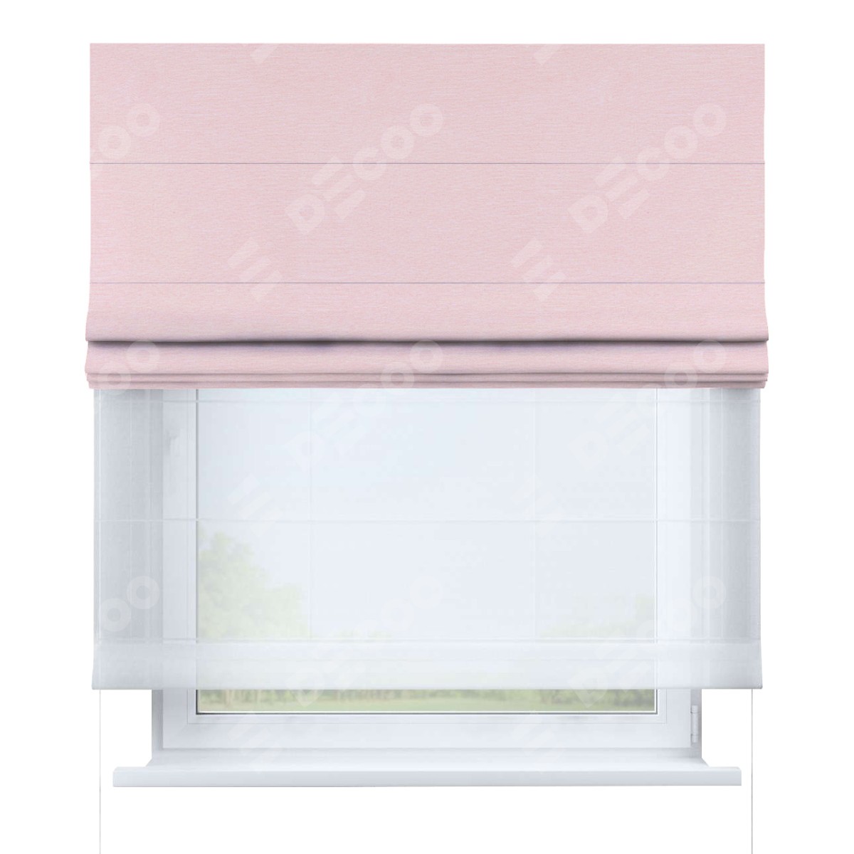 Римская штора день-ночь производителя «Cortin», используется для проёма, пошита из двух полотен, с лицевой стороны блэкаут однотонный розовый артикул 83046, вторая ткань тюль (по стандарту комплектуется тюль белого цвета артикул V-01). Имеет универсальный механизм и подходит для монтажа: на потолок, на стену и в нишу.