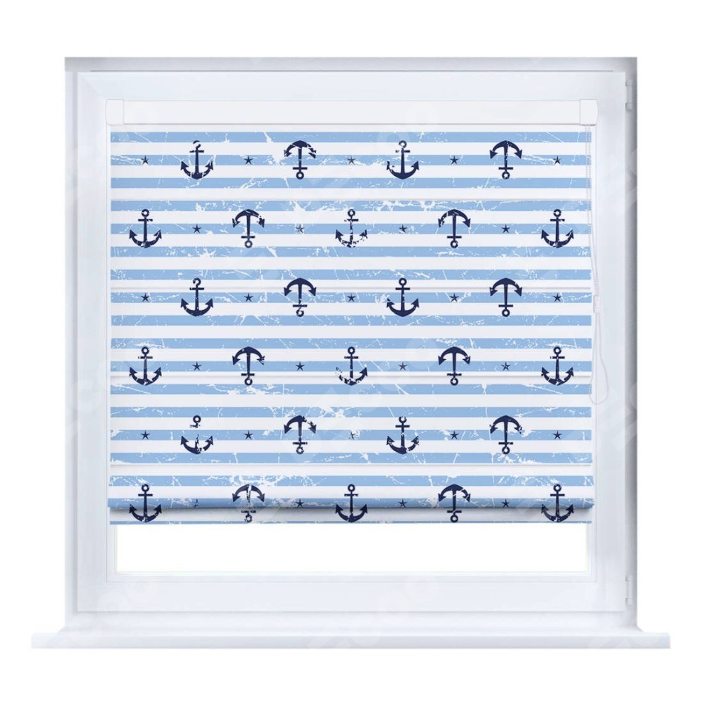 Римская штора производителя «Cortin», устанавливается на створку окна, пошита из ткани блэкаут с нанесением сублимационной печати «Полоски и якори». Штора шьётся по индивидуальным размерам, для данного типа римской шторы возможная ширина от 35 до 150 см., высота до 250 см.