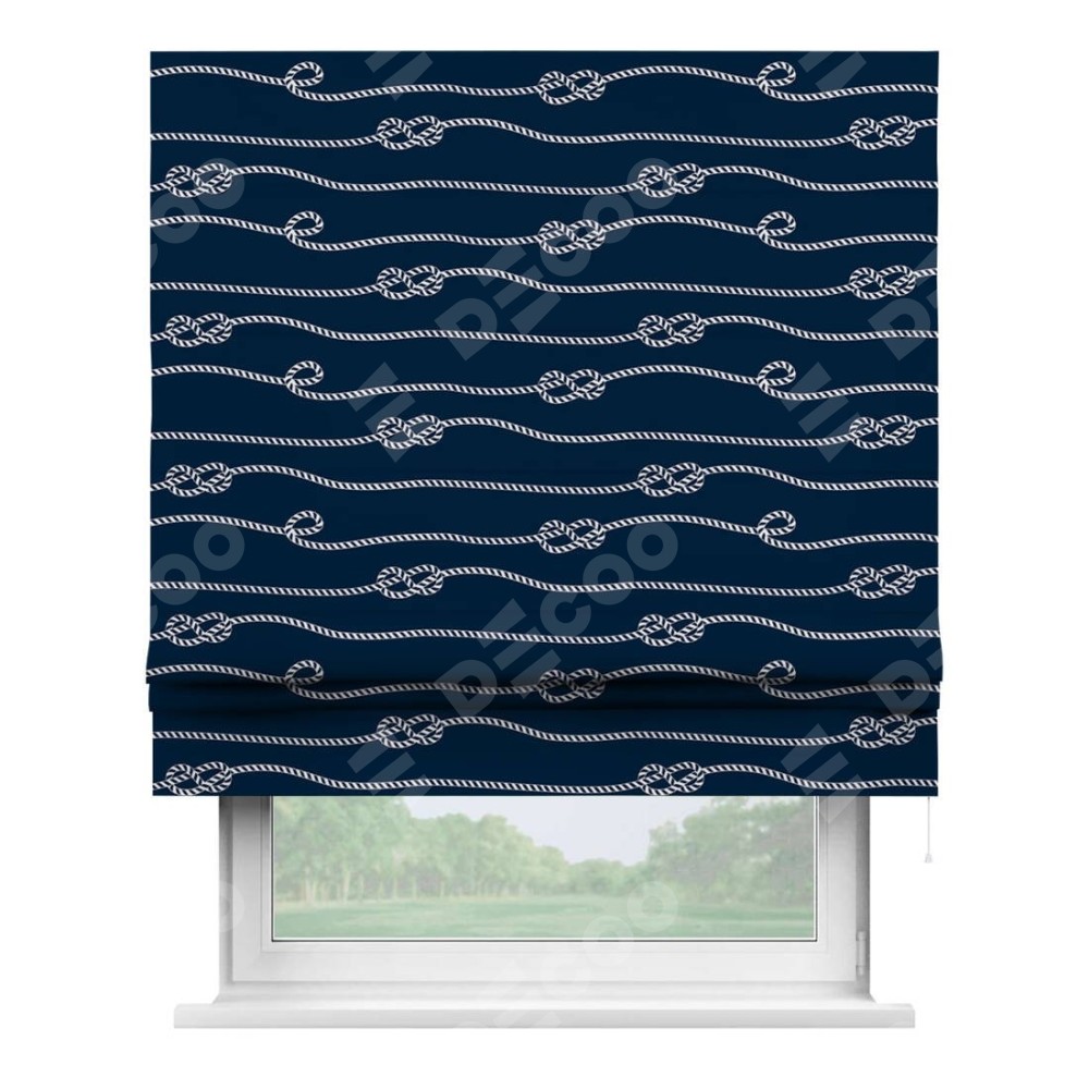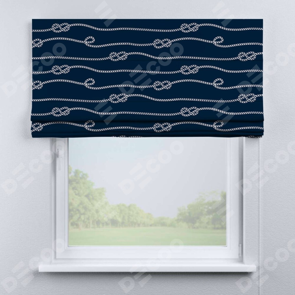 Римская штора производителя «Cortin», используется для проёма, пошита из ткани блэкаут с нанесением сублимационной печати «Морской узел». Имеет универсальный механизм и подходит для монтажа: на потолок, на стену и в нишу.