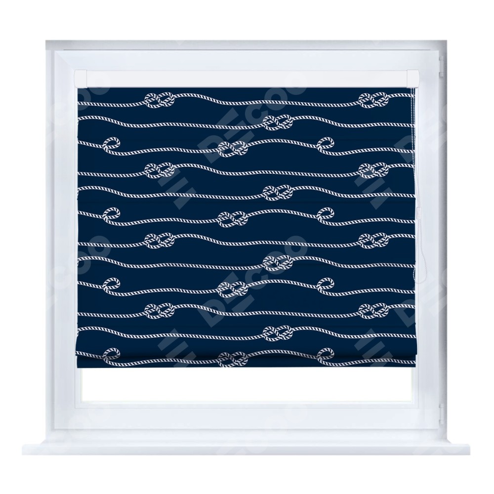 Римская штора кассетного типа, производителя «Cortin», устанавливается только на пластиковые окна и прилегает к стеклопакету, пошита из ткани блэкаут с нанесением сублимационной печати «Морской узел».