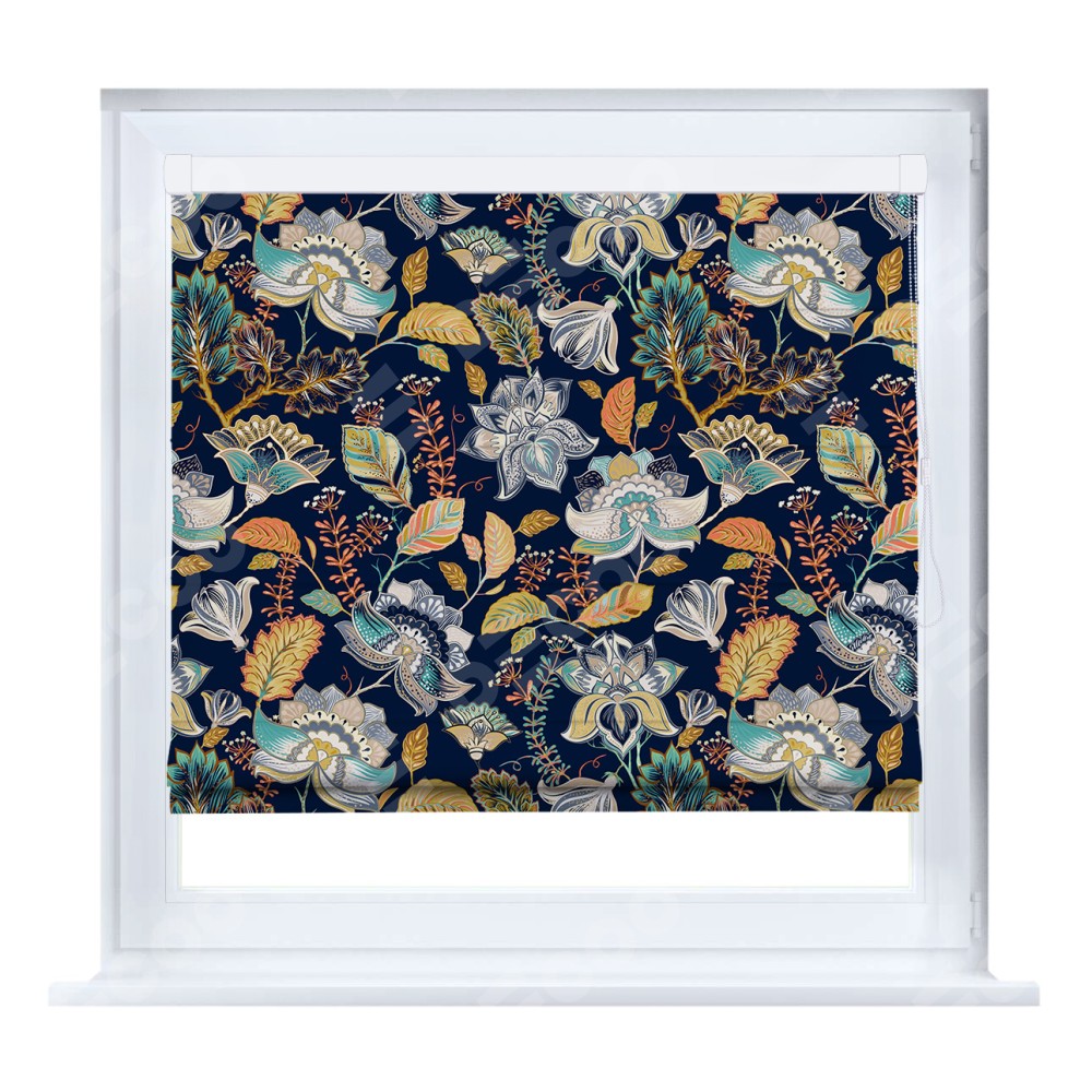 Римская штора кассетного типа, производителя «Cortin», устанавливается только на пластиковые окна и прилегает к стеклопакету, пошита из ткани блэкаут с нанесением сублимационной печати «Тёмный букет».