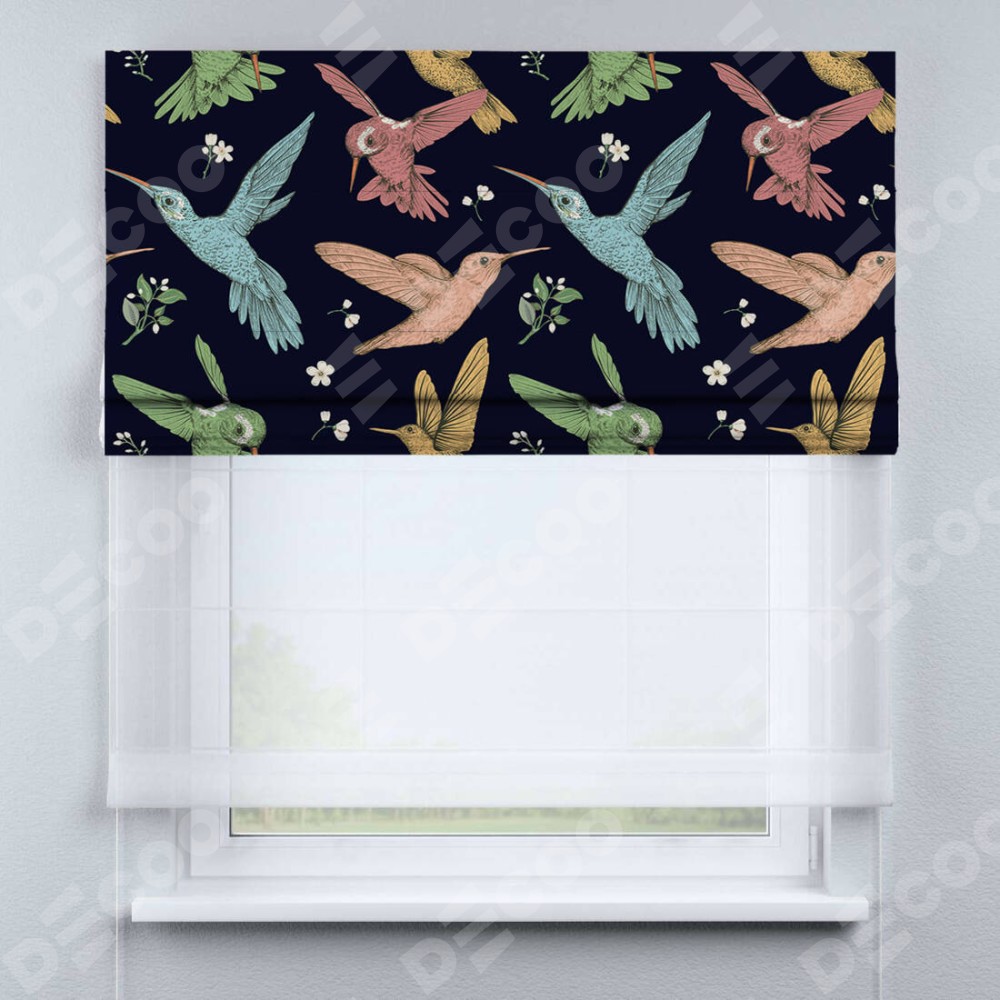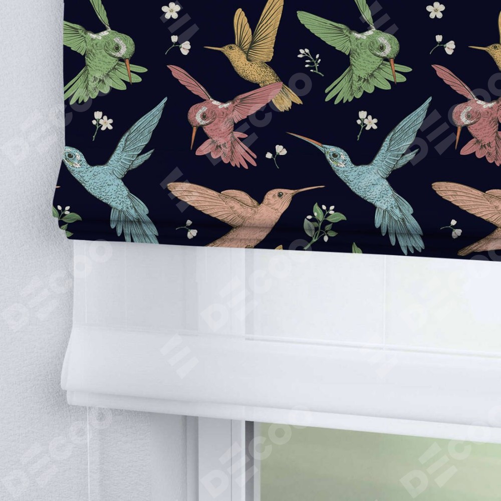 Римская штора день-ночь производителя «Cortin», используется для проёма, пошита из двух полотен, с лицевой блэкаут с нанесением сублимационной печати «Птицы и цветы», вторая ткань тюль (по стандарту комплектуется тюль белого цвета артикул V-01). Имеет универсальный механизм и подходит для монтажа: на потолок, на стену и в нишу.