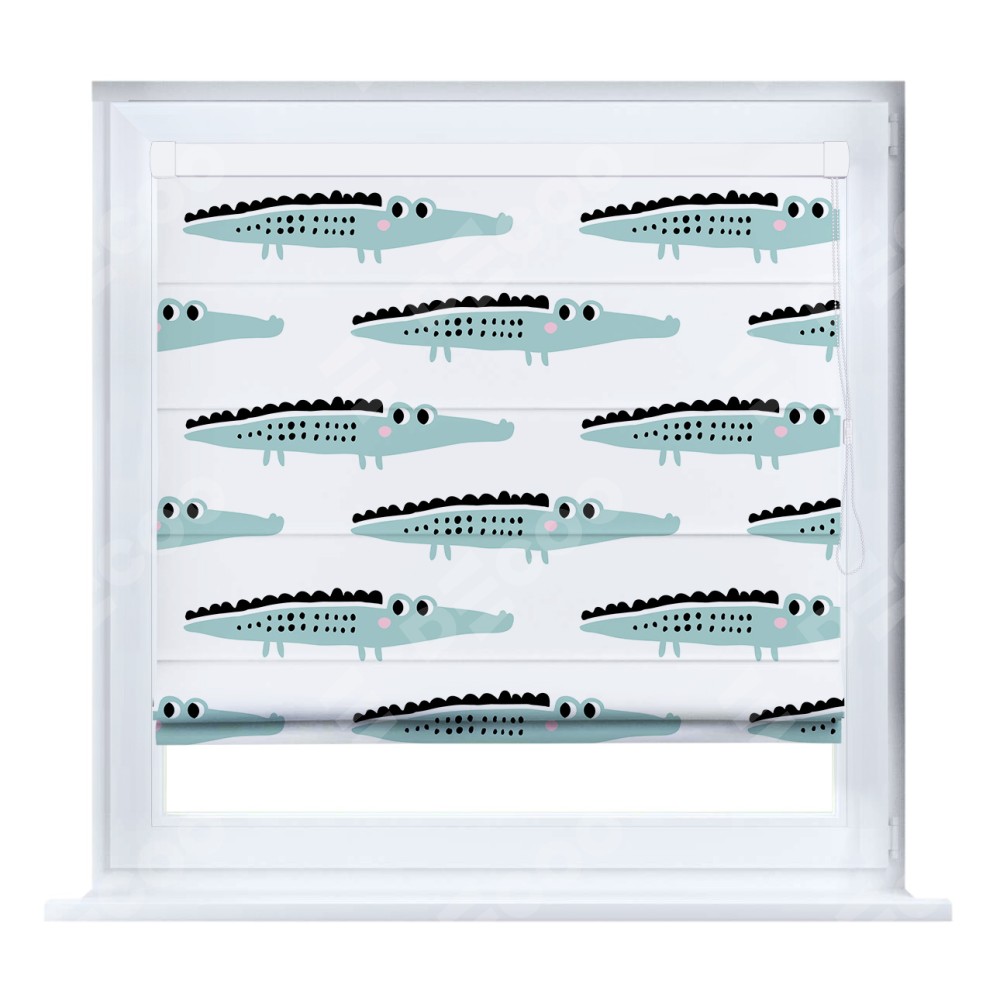 Римская штора кассетного типа, производителя «Cortin», устанавливается только на пластиковые окна и прилегает к стеклопакету, пошита из ткани блэкаут с нанесением сублимационной печати «Мистер Крок».