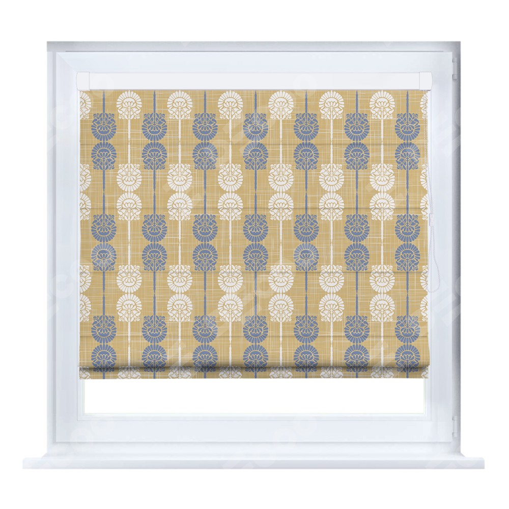 Римская штора кассетного типа, производителя «Cortin», устанавливается только на пластиковые окна и прилегает к стеклопакету, пошита из ткани блэкаут с нанесением сублимационной печати «Венок из ромашки».