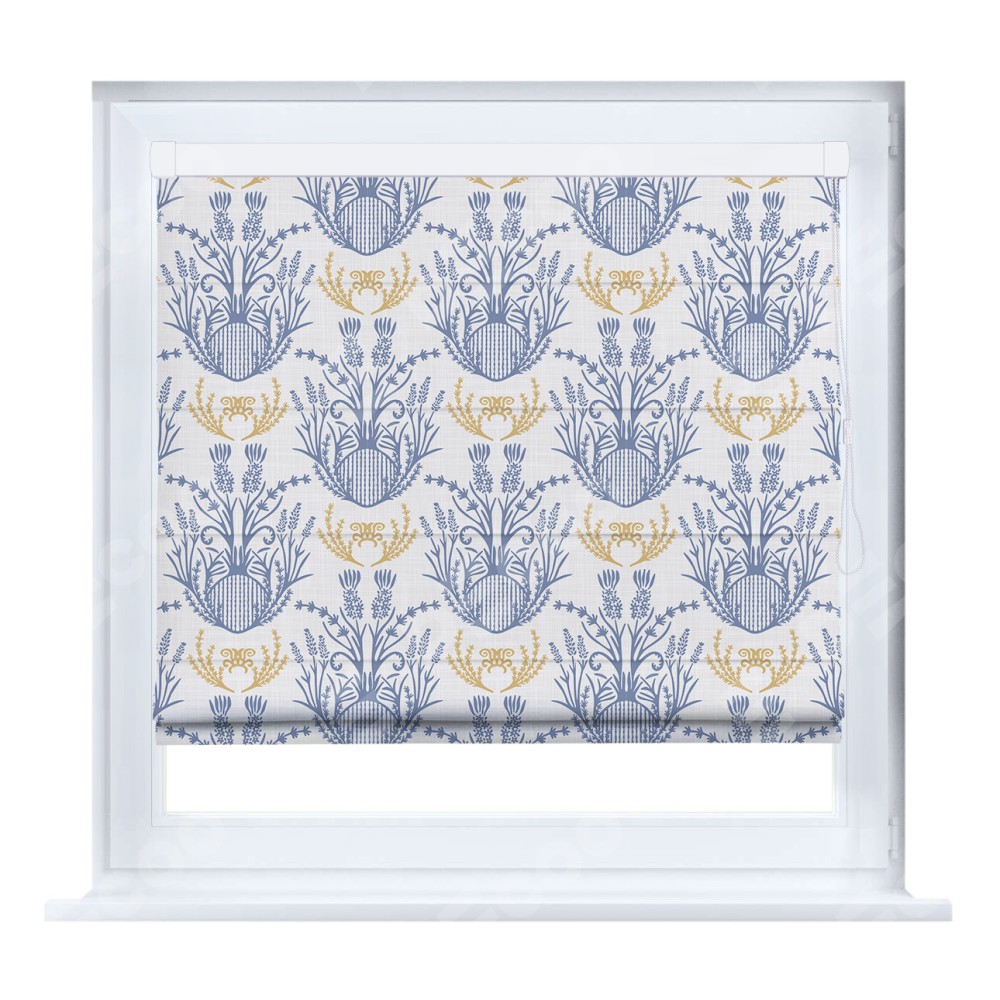 Римская штора кассетного типа, производителя «Cortin», устанавливается только на пластиковые окна и прилегает к стеклопакету, пошита из ткани блэкаут с нанесением сублимационной печати «Шикарная лаванда».