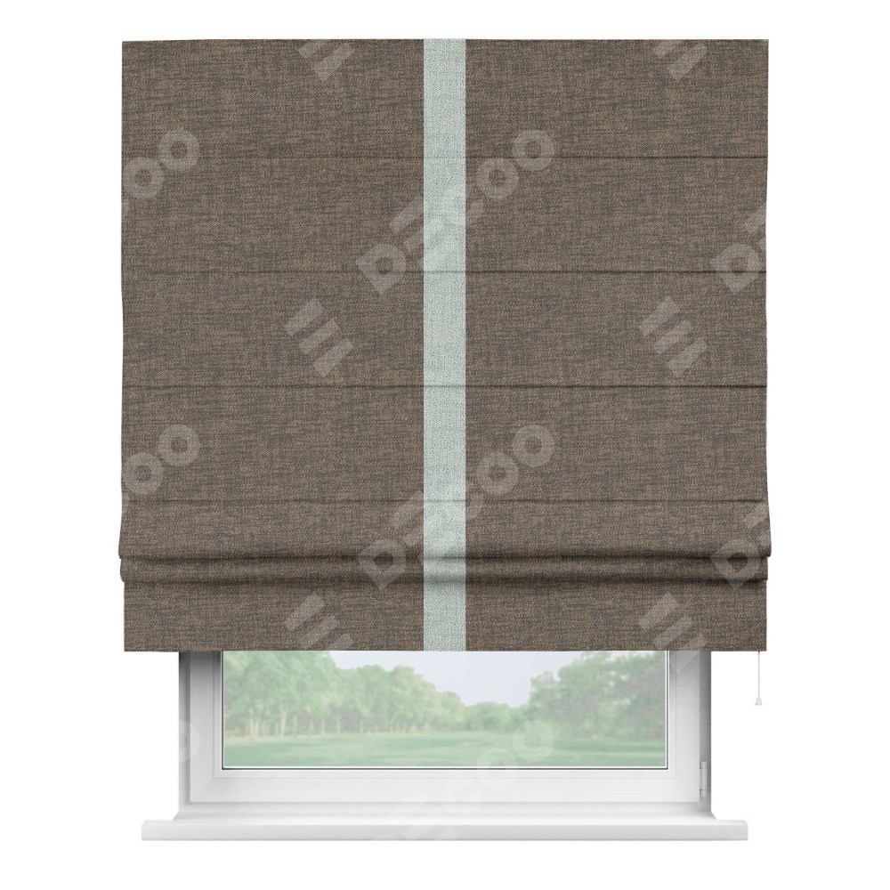 Римская штора производителя «Cortin», используется для проёма, пошита из ткани рогожка димаут коричневый, артикул 80420. Отделка шторы кантом «Хайвэй», ткань для канта используется из рогожки димаут разной расцветки на выбор. Имеет универсальный механизм и подходит для монтажа: на потолок, на стену и в нишу.