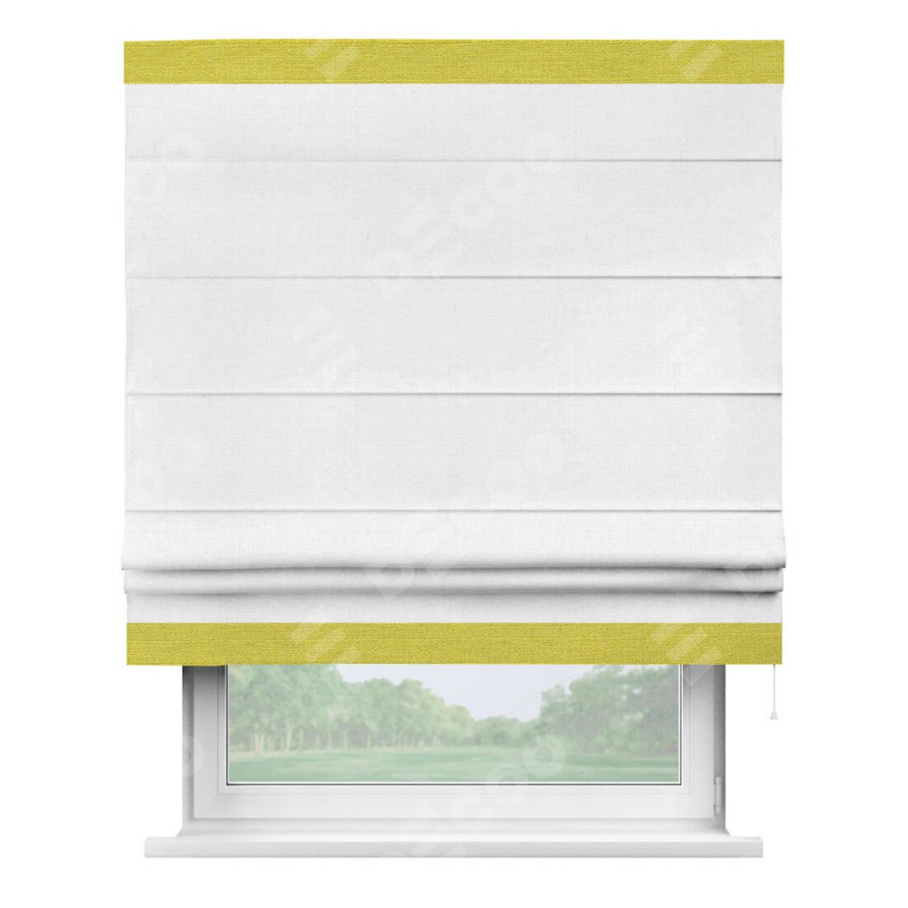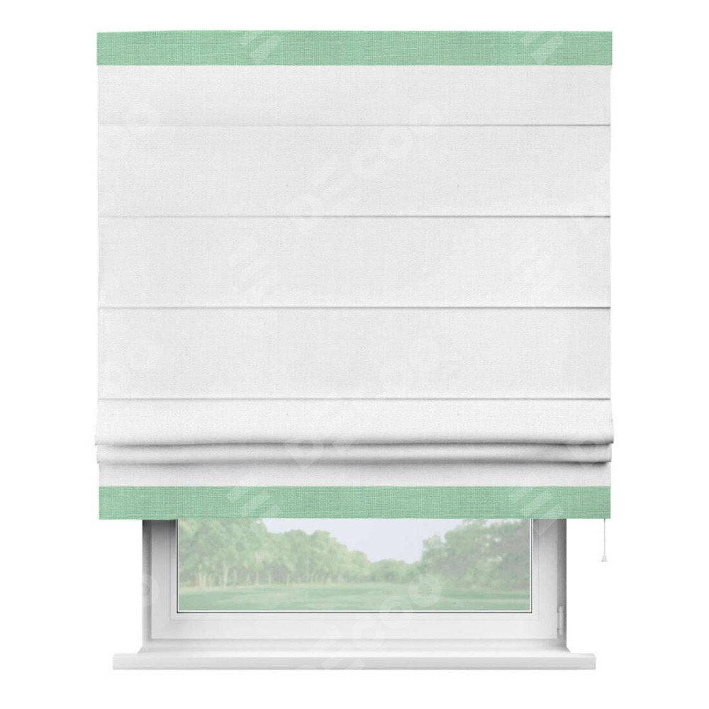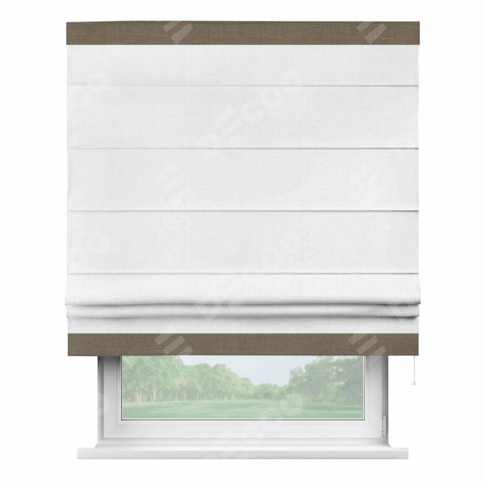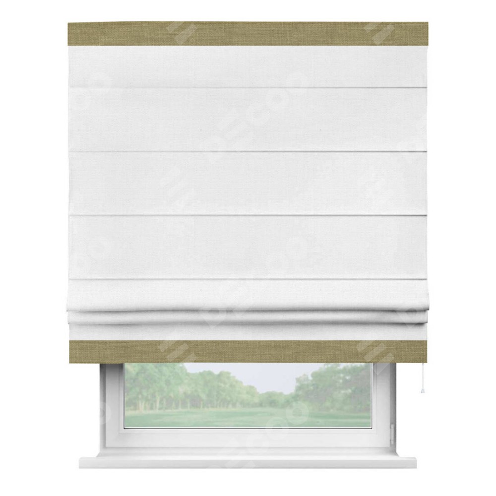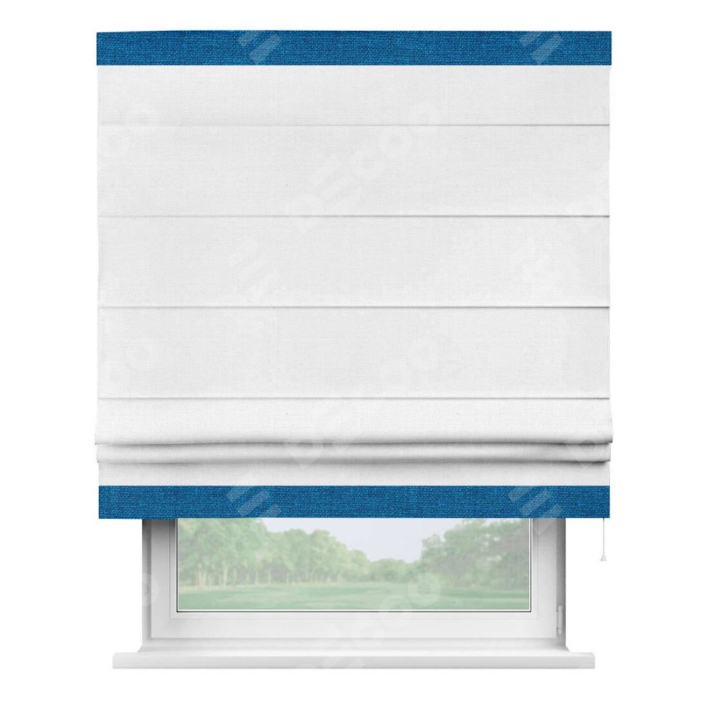 Римская штора производителя «Cortin», используется для проёма, пошита из ткани лён белый, артикул 53430. Отделка шторы кантом «Горизонт», ткань для канта используется из льна разной расцветки на выбор. Имеет универсальный механизм и подходит для монтажа: на потолок, на стену и в нишу.