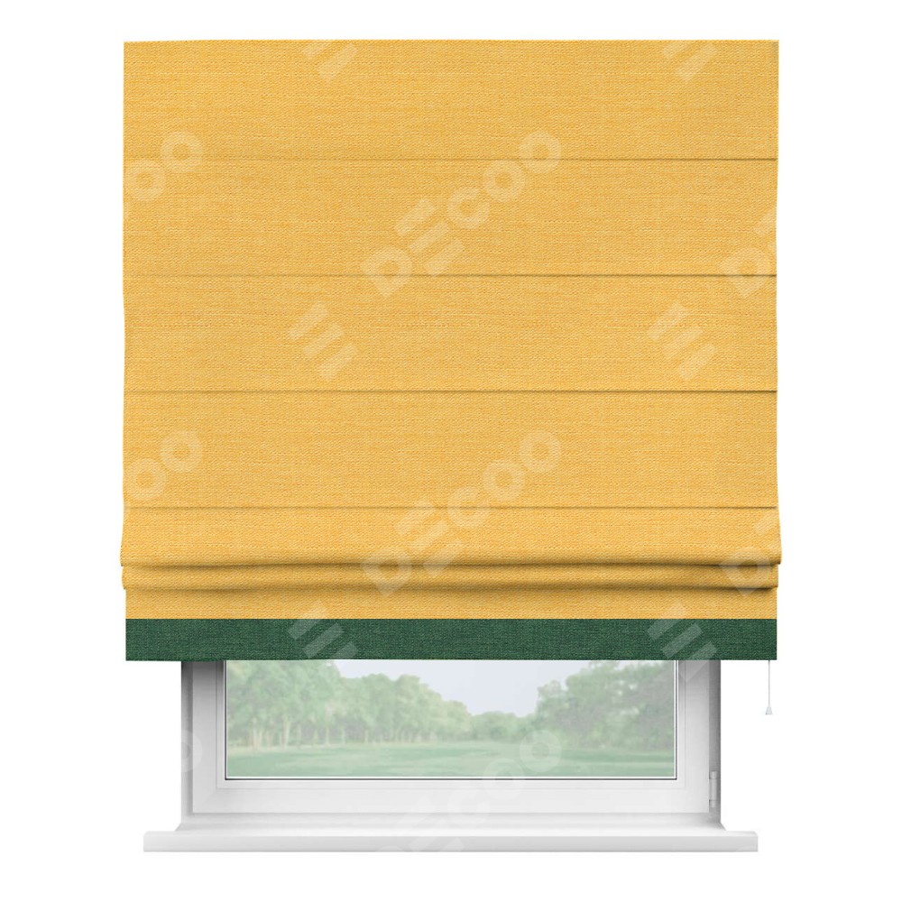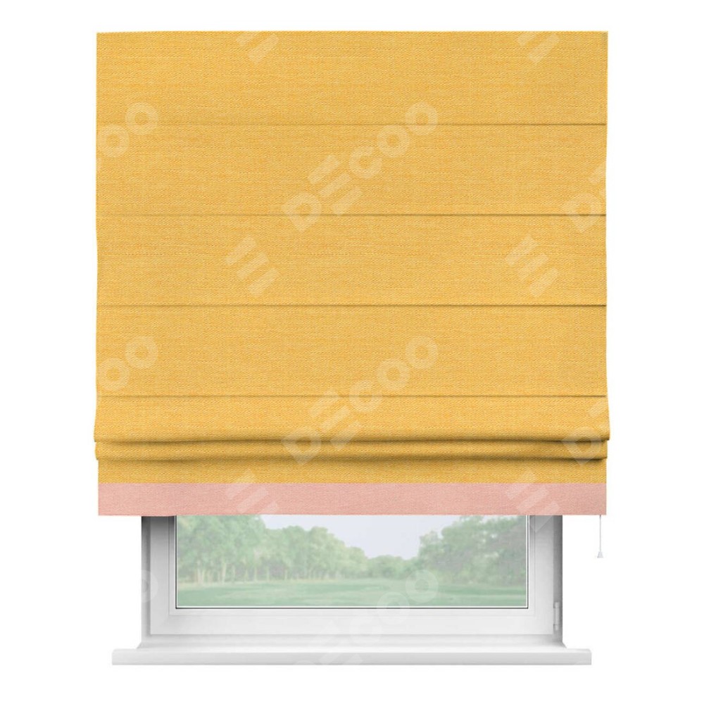 Римская штора производителя «Cortin», используется для проёма, пошита из ткани лён желтый, артикул 63738. Отделка шторы кантом «Джестер», ткань для канта используется из льна разной расцветки на выбор. Имеет универсальный механизм и подходит для монтажа: на потолок, на стену и в нишу.