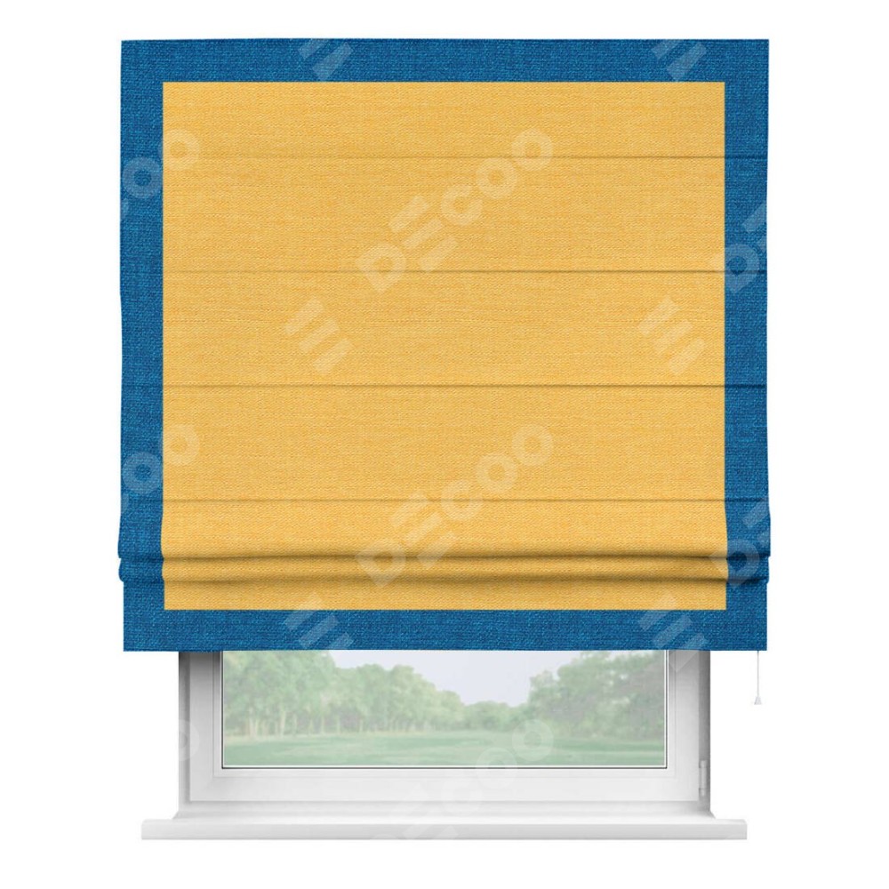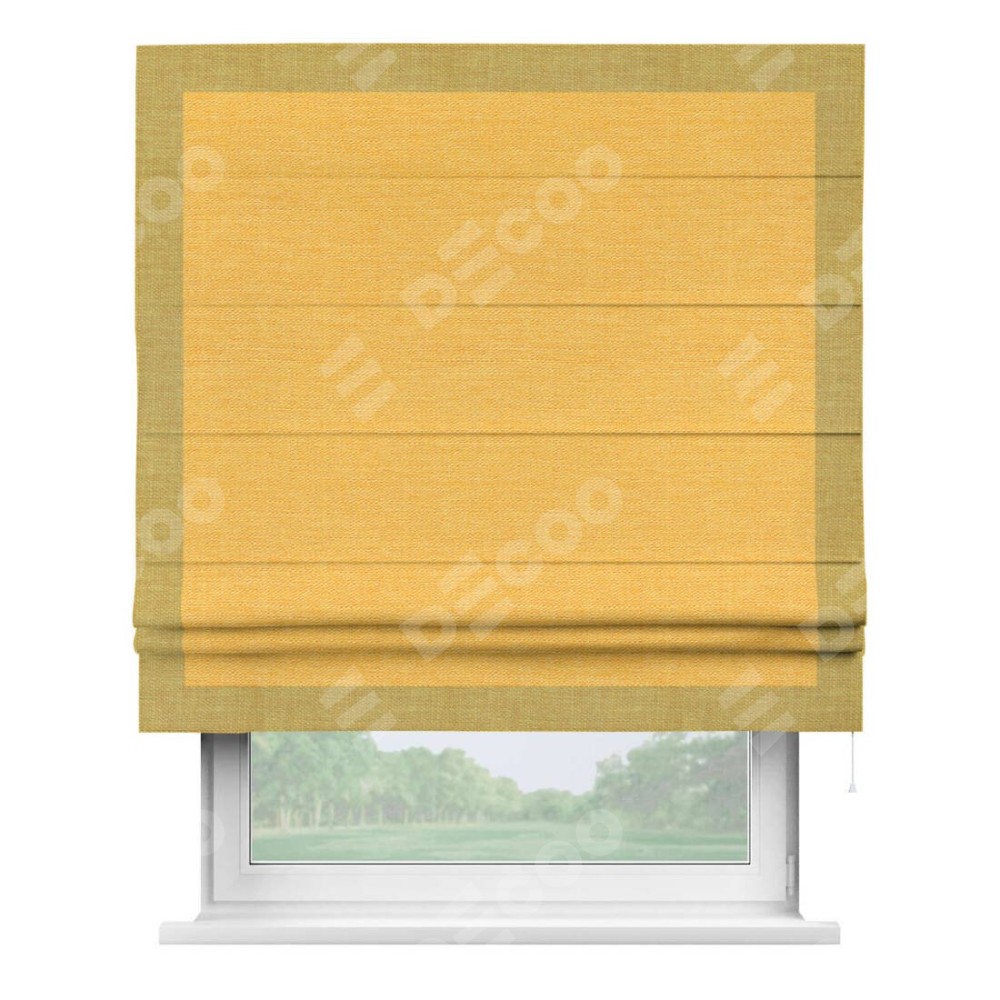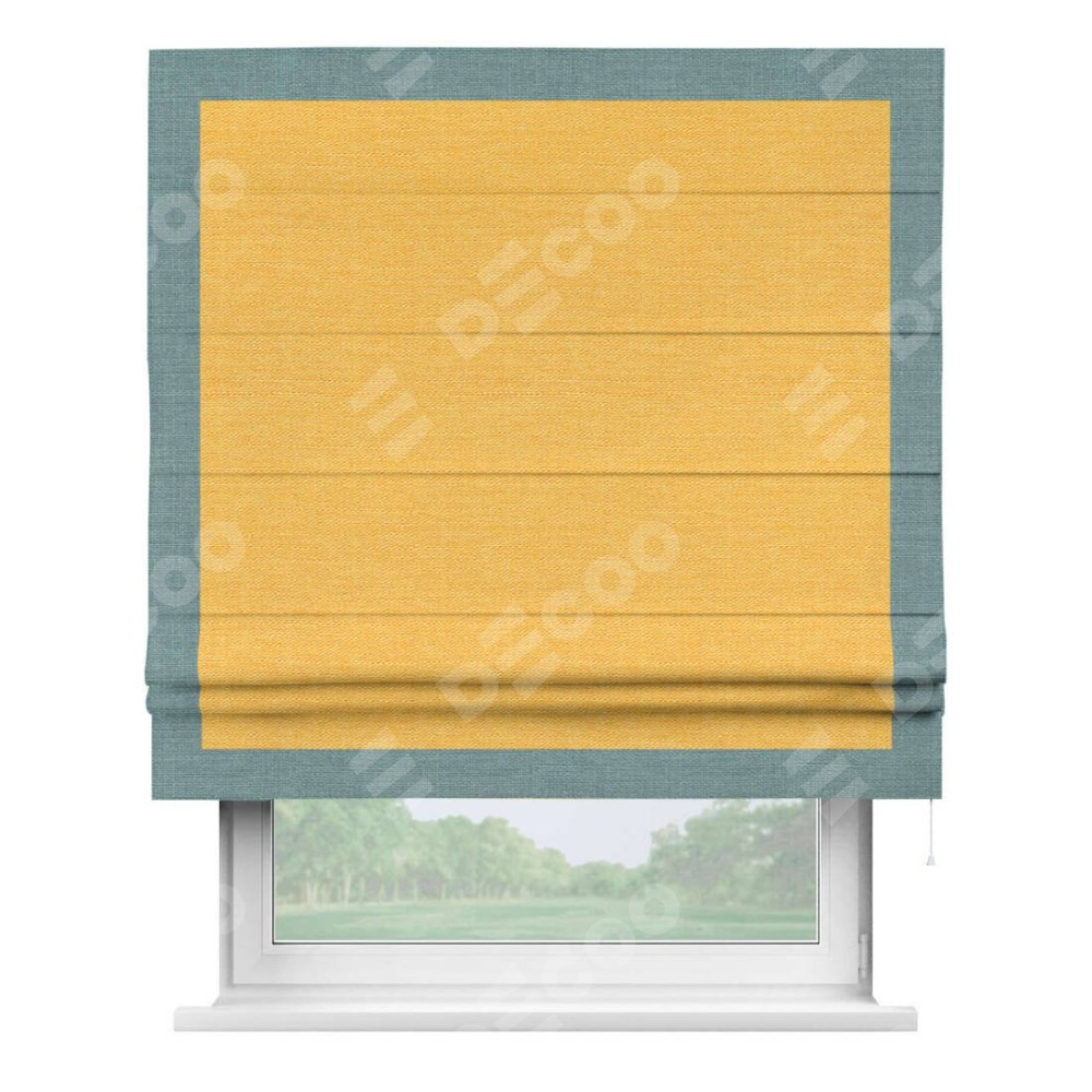 Римская штора производителя «Cortin», используется для проёма, пошита из ткани лён желтый, артикул 63738. Отделка шторы кантом «Чесс», ткань для канта используется из льна разной расцветки на выбор. Имеет универсальный механизм и подходит для монтажа: на потолок, на стену и в нишу.