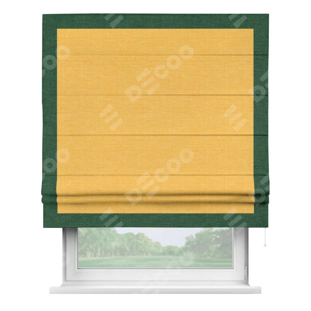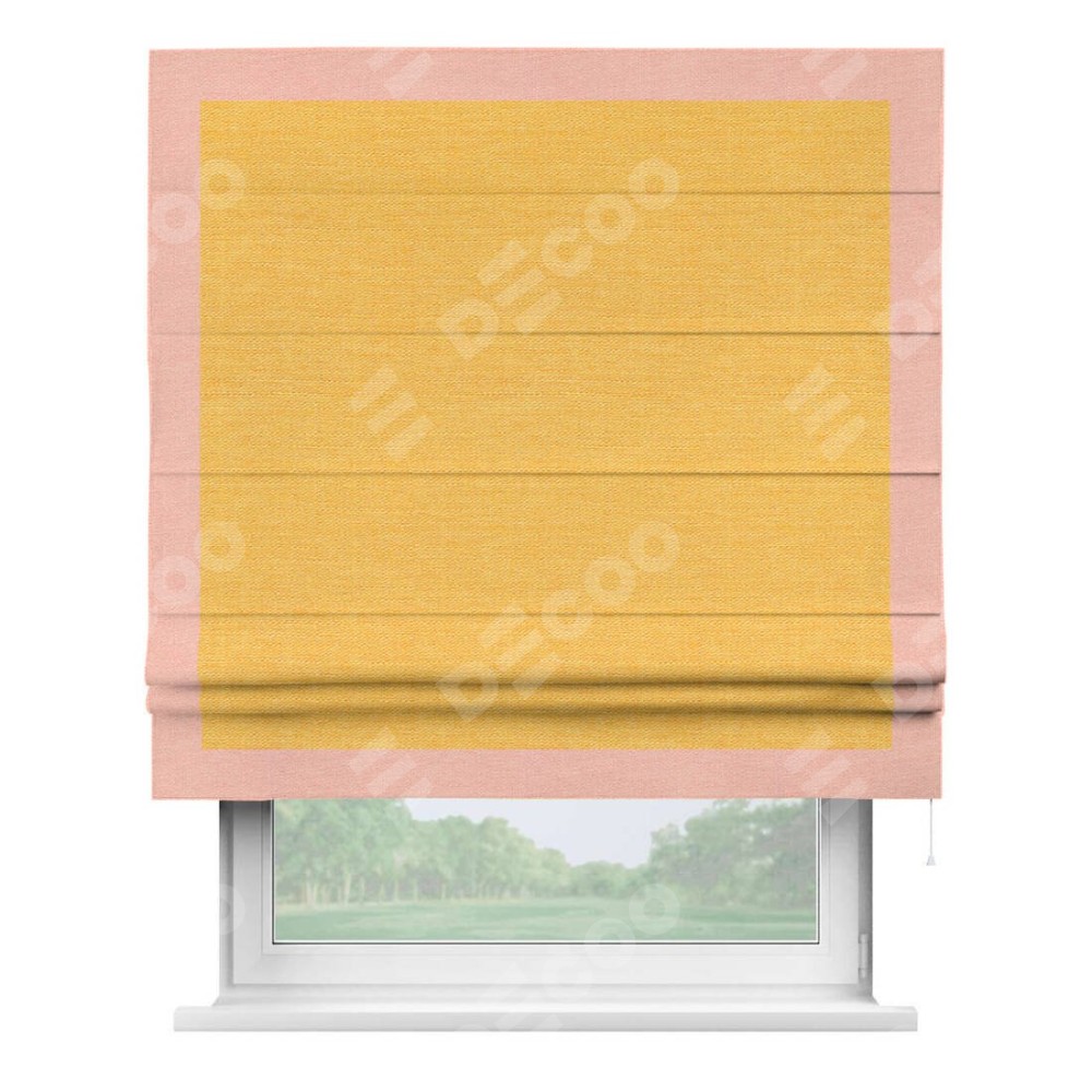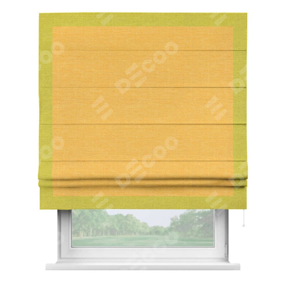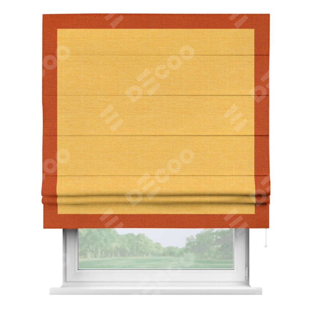 Римская штора производителя «Cortin», используется для проёма, пошита из ткани лён желтый, артикул 63738. Отделка шторы кантом «Чесс», ткань для канта используется из льна разной расцветки на выбор. Имеет универсальный механизм и подходит для монтажа: на потолок, на стену и в нишу.