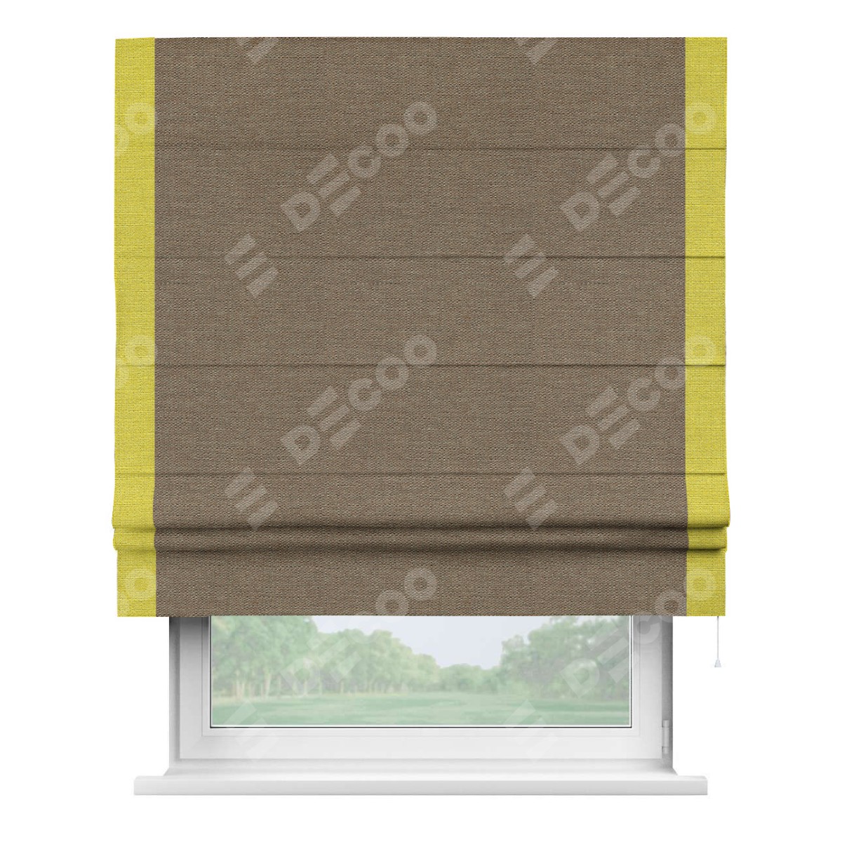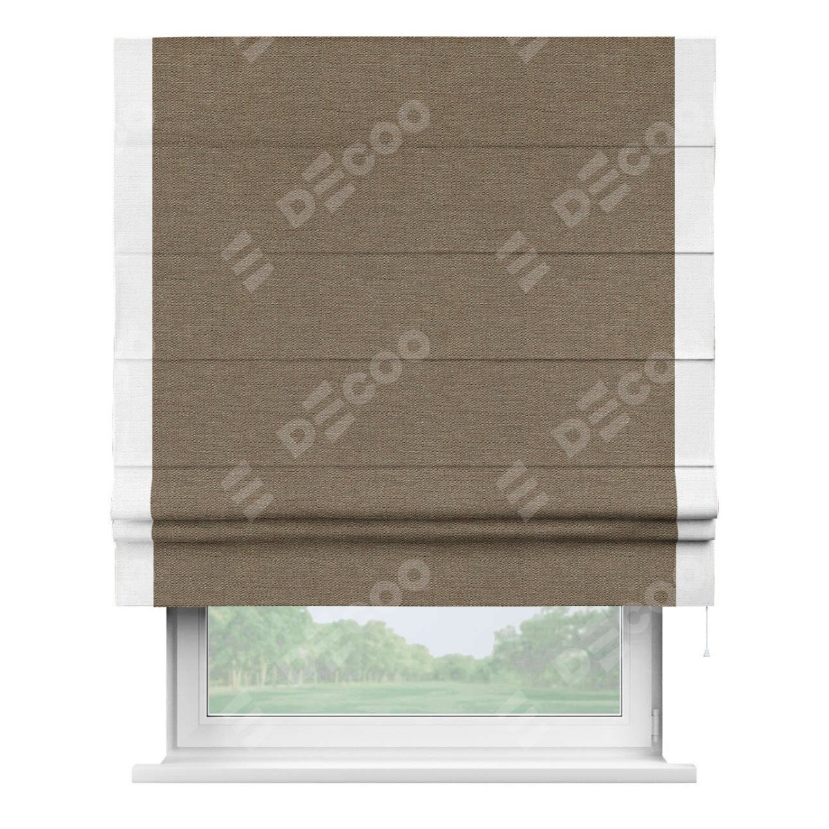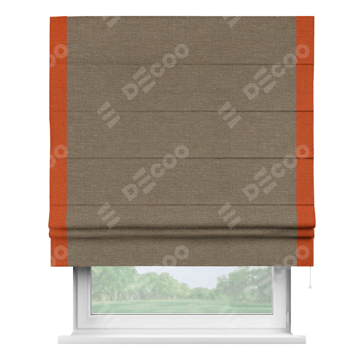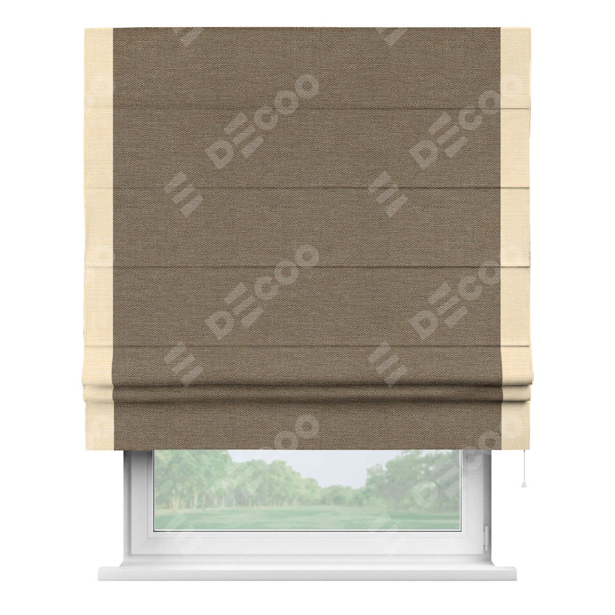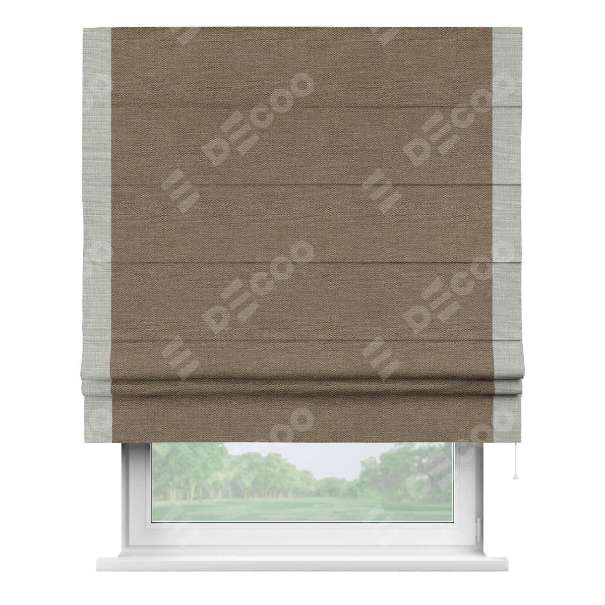Римская штора производителя «Cortin», используется для проёма, пошита из ткани лён светло-коричневый, артикул 53434. Отделка шторы кантом «Стрим Дуо», ткань для канта используется из льна разной расцветки на выбор. Имеет универсальный механизм и подходит для монтажа: на потолок, на стену и в нишу.