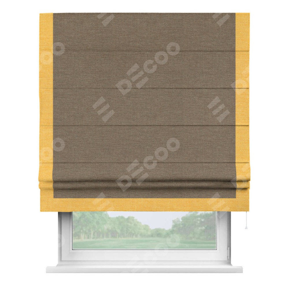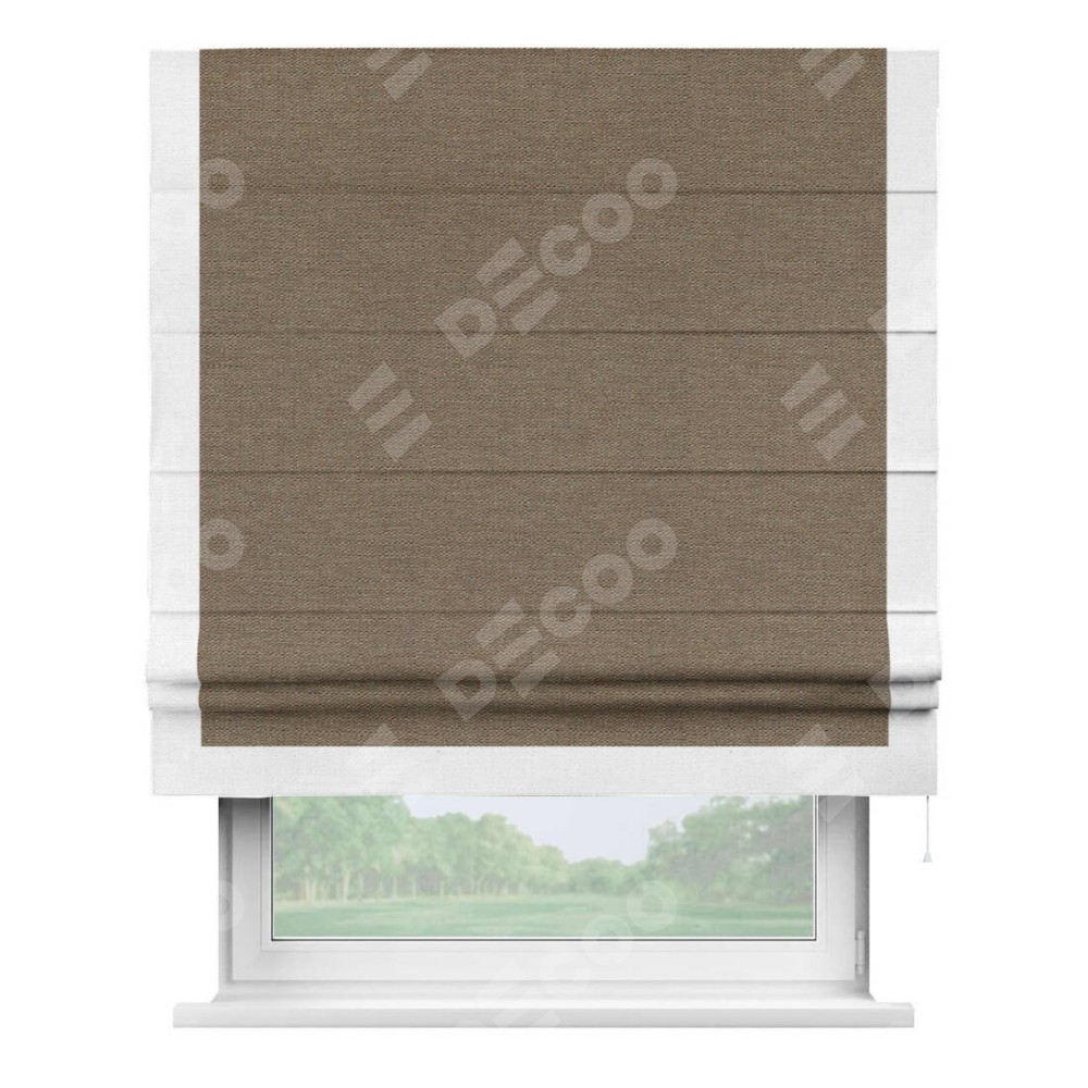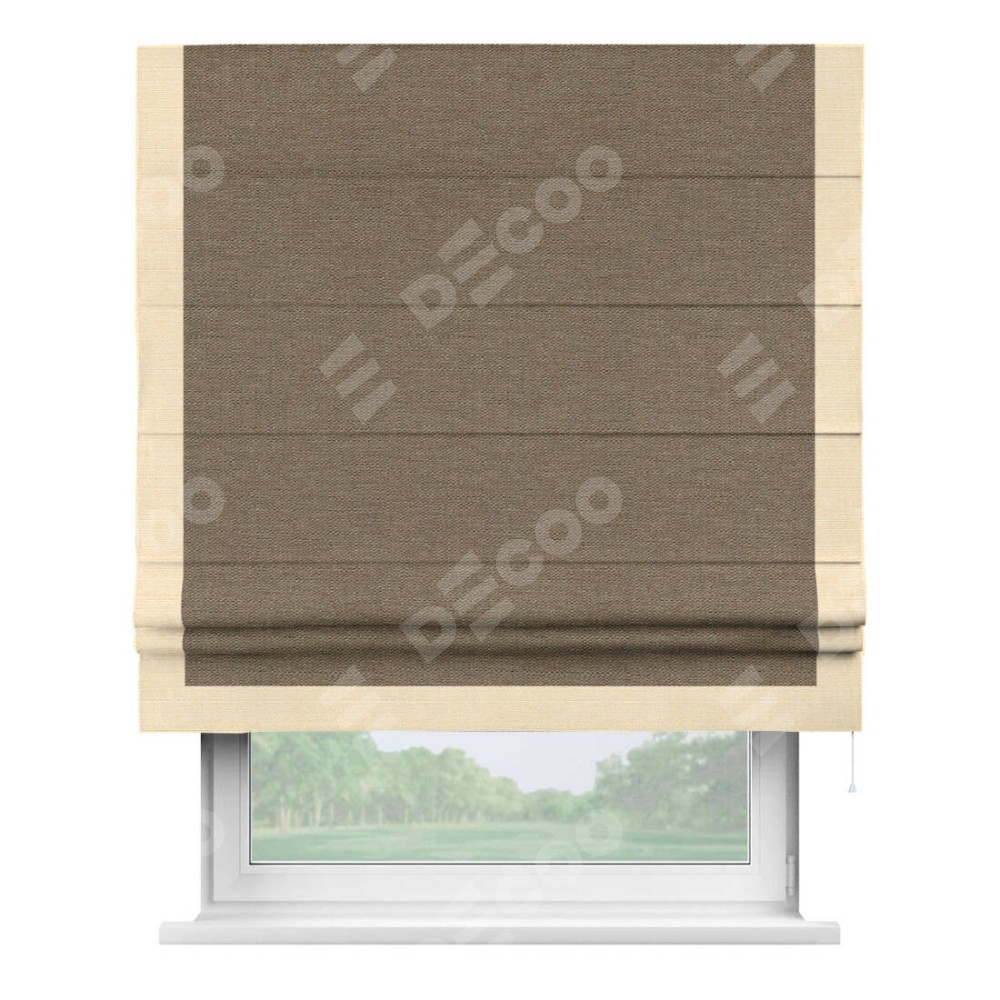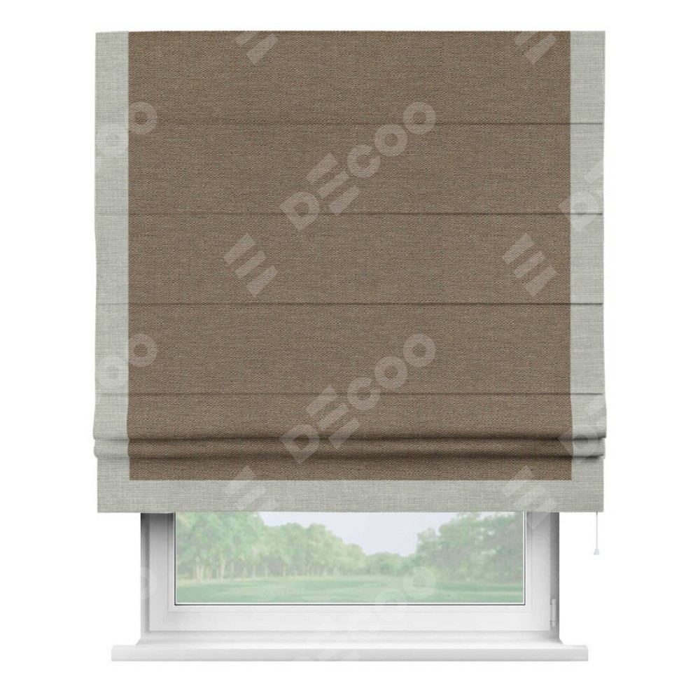 Римская штора производителя «Cortin», используется для проёма, пошита из ткани лён светло-коричневый, артикул 53434. Отделка шторы кантом «Виктория», ткань для канта используется из льна разной расцветки на выбор. Имеет универсальный механизм и подходит для монтажа: на потолок, на стену и в нишу.