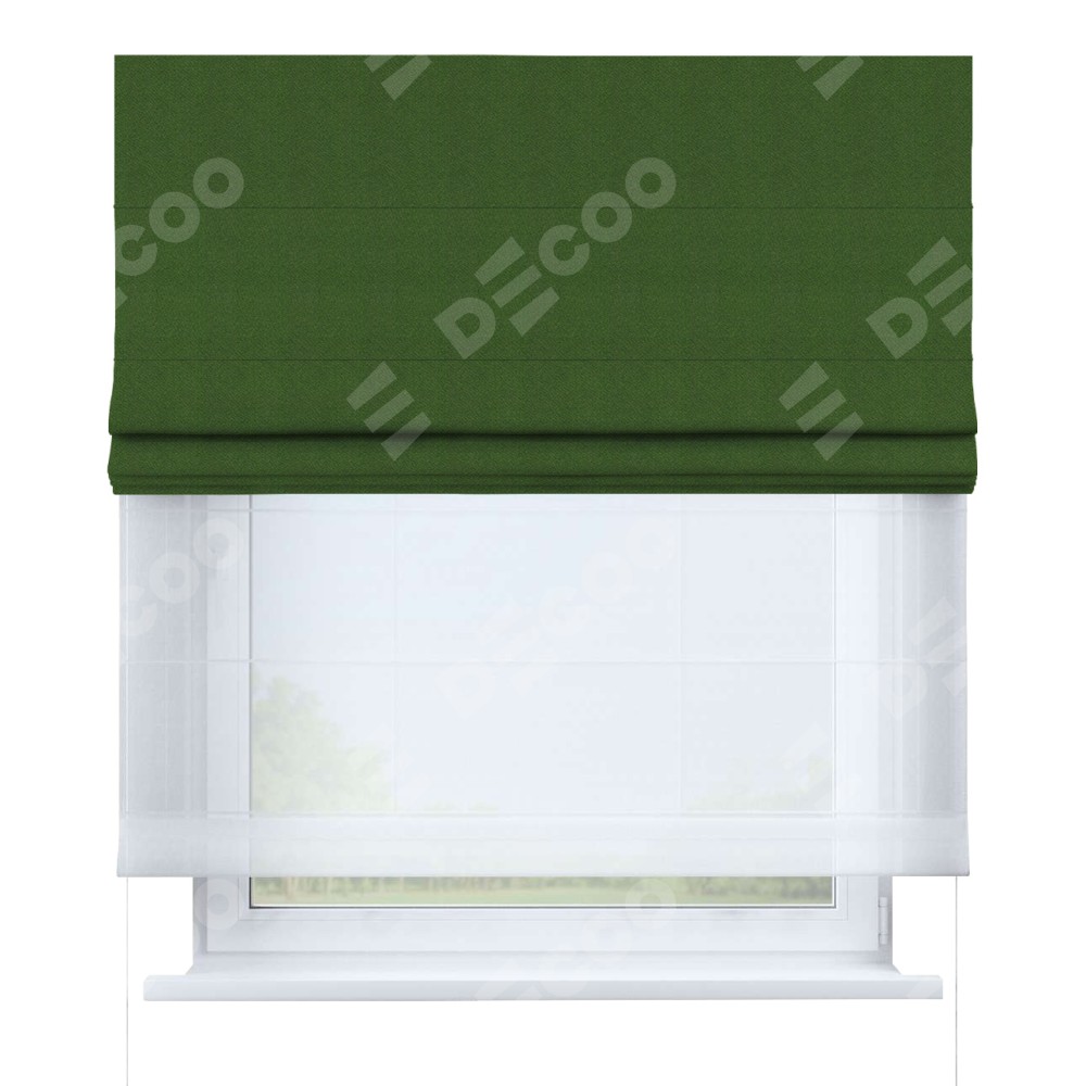 Римская штора день-ночь производителя «Cortin», используется для проёма, пошита из двух полотен, с лицевой стороны блэкаут однотонный зелёный перламутр артикул 81859п, вторая ткань тюль (по стандарту комплектуется тюль белого цвета артикул V-01). Имеет универсальный механизм и подходит для монтажа: на потолок, на стену и в нишу.