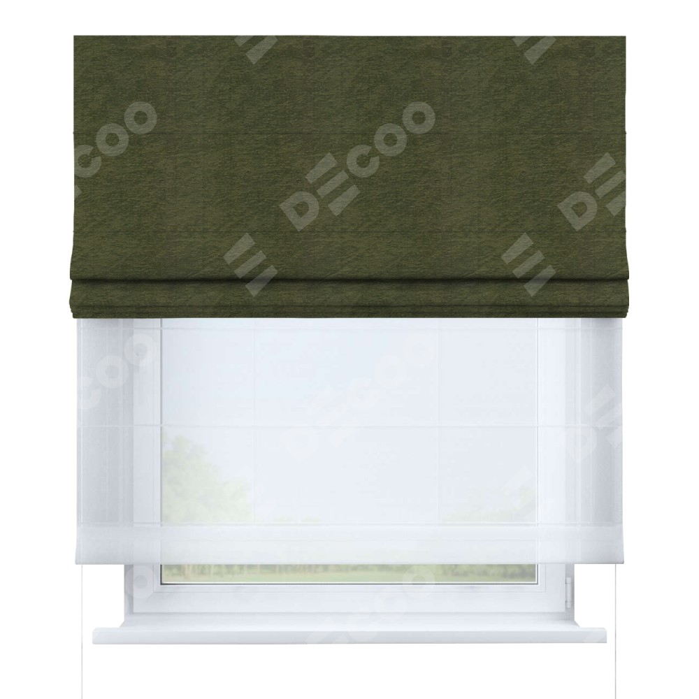Римская штора день-ночь производителя «Cortin», используется для проёма, пошита из двух полотен, с лицевой стороны софт однотонный зелёный артикул 33110, вторая ткань тюль (по стандарту комплектуется тюль белого цвета артикул V-01). Имеет универсальный механизм и подходит для монтажа: на потолок, на стену и в нишу.