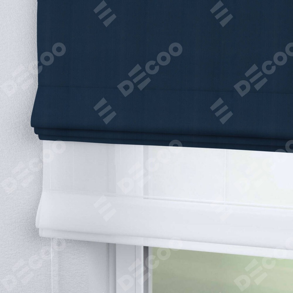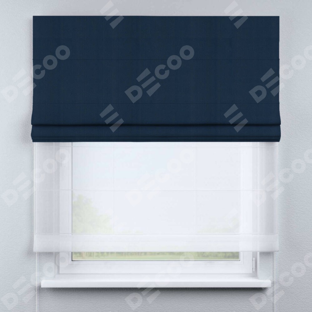 Римская штора день-ночь производителя «Cortin», используется для проёма, пошита из двух полотен, с лицевой стороны блэкаут однотонный синий артикул 29327, вторая ткань тюль (по стандарту комплектуется тюль белого цвета артикул V-01). Имеет универсальный механизм и подходит для монтажа: на потолок, на стену и в нишу.