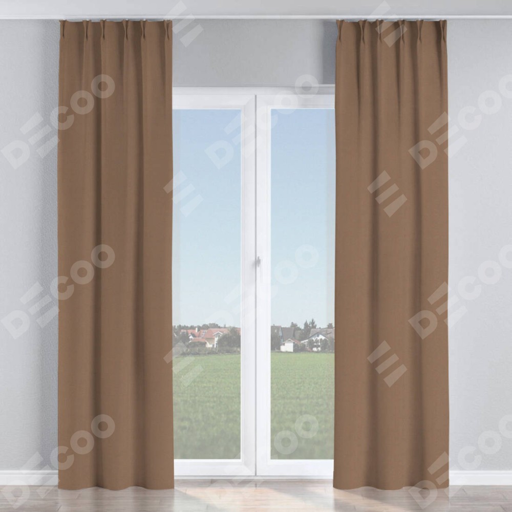 Комплект прямых штор, от производителя «Cortin», пошиты из ткани блэкаут однотонный коричневый, артикул ткани 88285. С изнаночной стороны в верхней части штор пристрачивается шторная лента с декоративными складками «Кустик». Для создания элегантных складок прямые шторы шьются по стандарту с коэффициентом 1:2 (на 100 см. ширины проёма 200 см. ширины ткани).