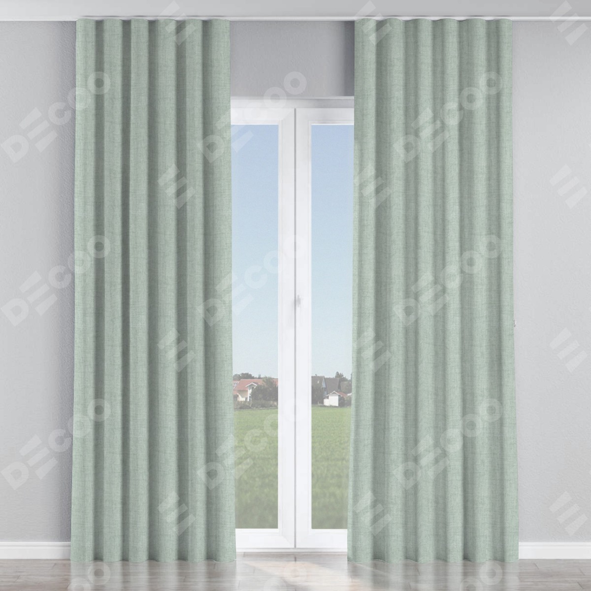 Комплект прямых штор, от производителя «Cortin», пошиты из ткани рогожка димаут серый, артикул ткани 80426. С изнаночной стороны в верхней части штор пристрачивается шторная лента с декоративными складками «Волна». Для создания элегантных складок прямые шторы шьются по стандарту с коэффициентом 1:2 (на 100 см. ширины проёма 200 см. ширины ткани).