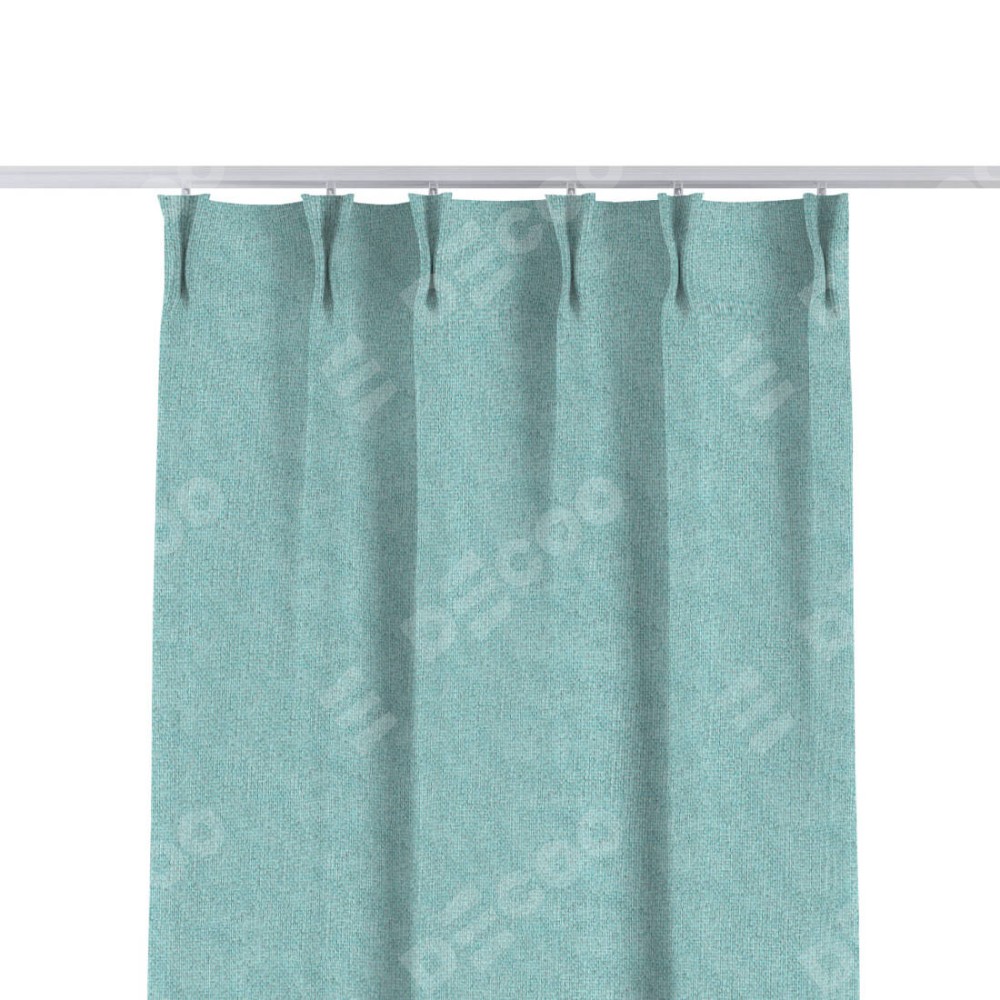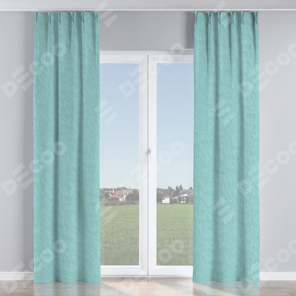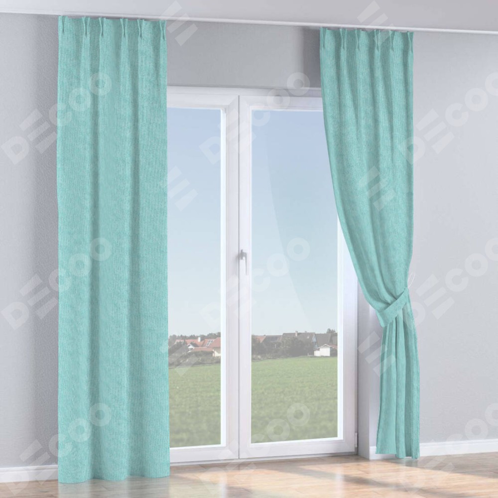 Комплект прямых штор, от производителя «Cortin», пошиты из ткани лён димаут бирюзовый, артикул ткани 23. С изнаночной стороны в верхней части штор пристрачивается шторная лента с декоративными складками «Кустик». Для создания элегантных складок прямые шторы шьются по стандарту с коэффициентом 1:2 (на 100 см. ширины проёма 200 см. ширины ткани).