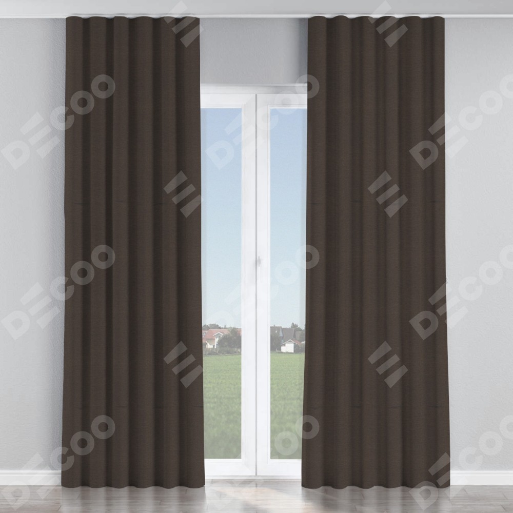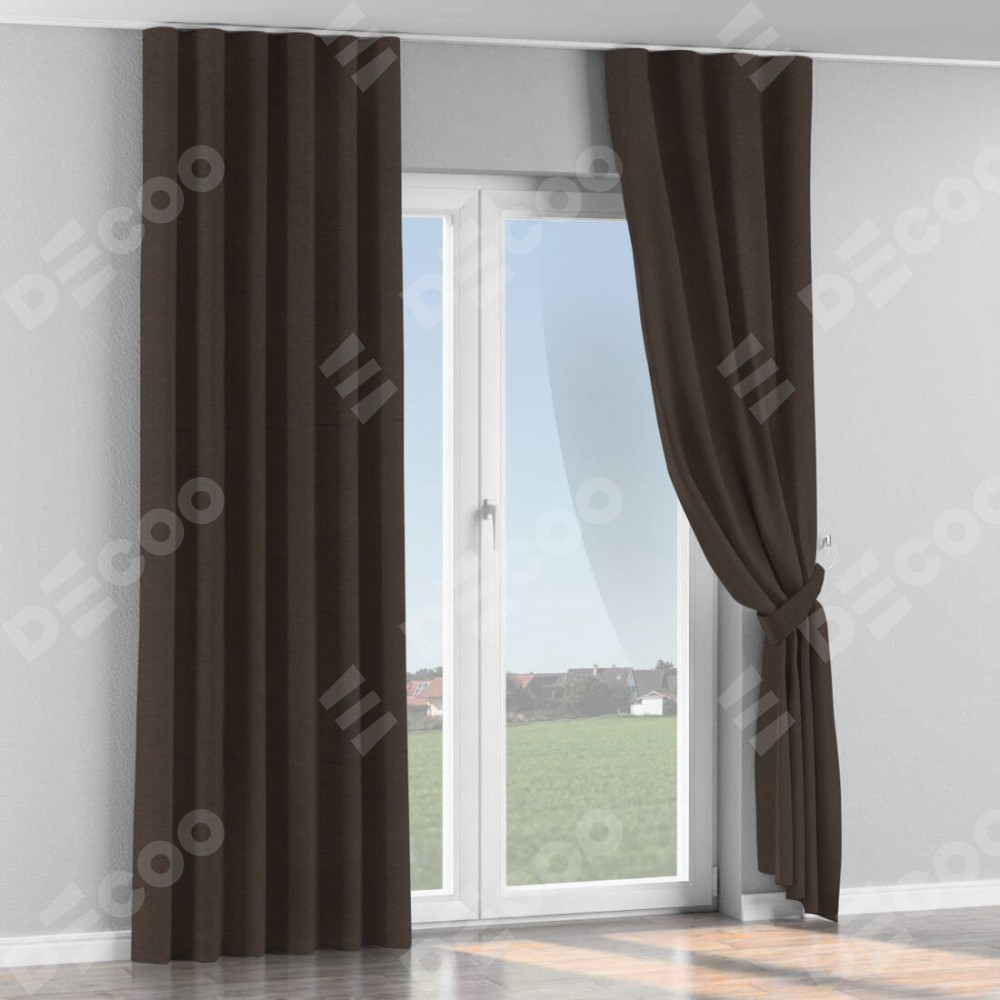 Комплект прямых штор, от производителя «Cortin», пошиты из ткани лён димаут венге, артикул ткани 85410. С изнаночной стороны в верхней части штор пристрачивается шторная лента с декоративными складками «Волна». Для создания элегантных складок прямые шторы шьются по стандарту с коэффициентом 1:2 (на 100 см. ширины проёма 200 см. ширины ткани).
