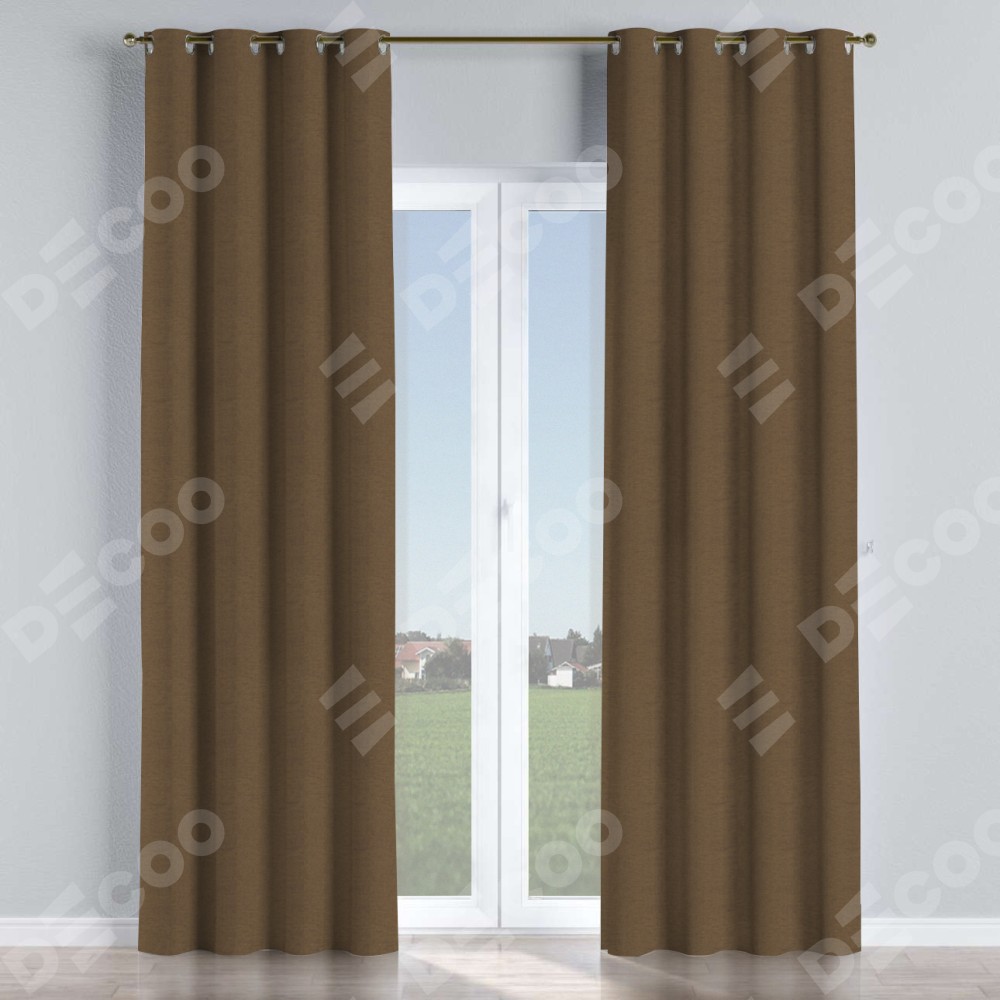 Комплект прямых штор, от производителя «Cortin», пошиты из ткани лён димаут тёмно-коричневый, артикул ткани 83030. Данная модель пошита на люверсах, комплектуется на выбор круглым карнизом и подходит для монтажа на стену или потолок. Прямые шторы на люверсах шьются по стандарту с коэффициентом 1/2 (на 100 см. ширины проёма 200 см. ширины ткани), отличительным преимуществом данной модели является простой способ монтажа. Достаточно повесить ее на трубу и штора готова!