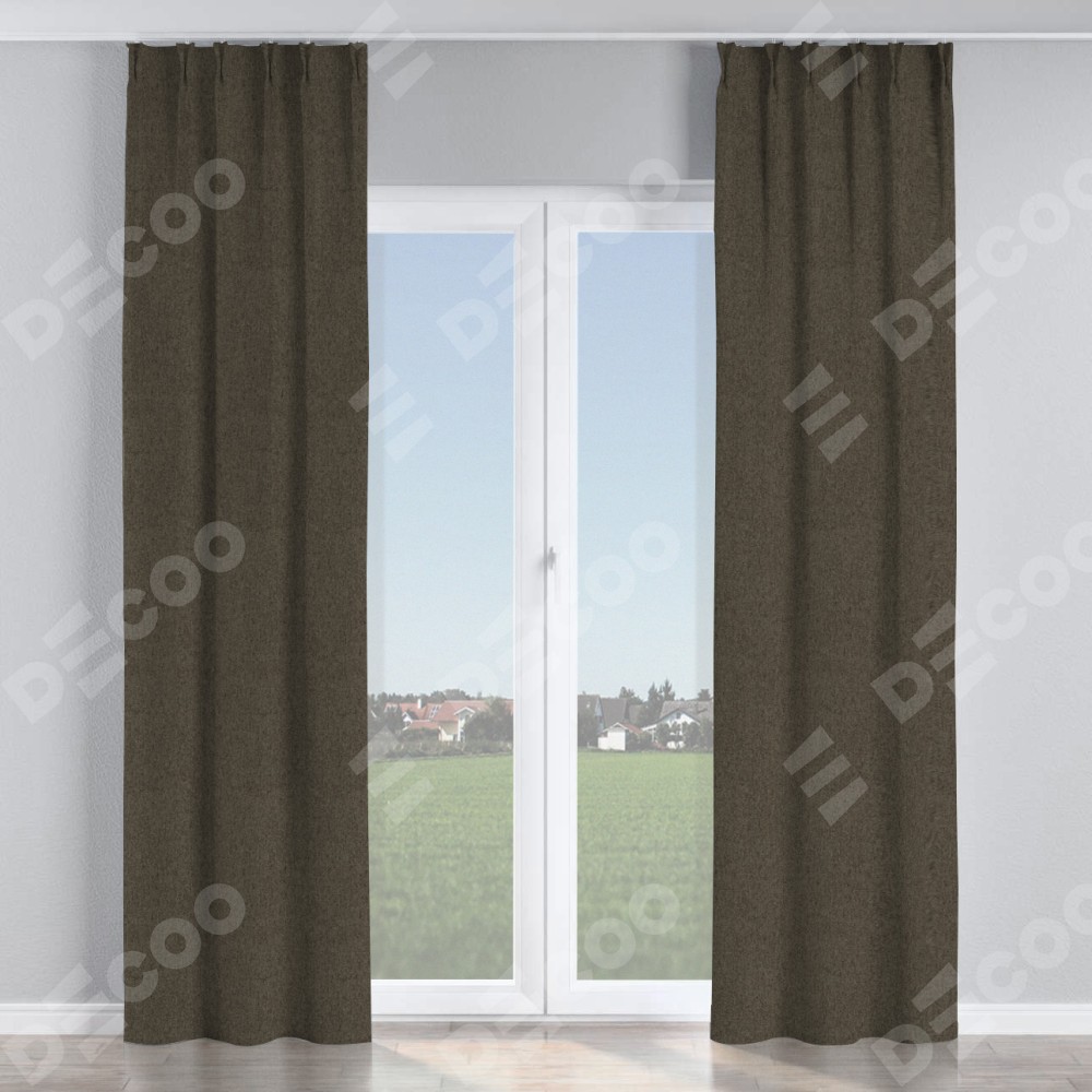 Комплект прямых штор, от производителя «Cortin», пошиты из ткани твид блэкаут тёмно-коричневый, артикул ткани 21584. С изнаночной стороны в верхней части штор пристрачивается шторная лента с декоративными складками «Кустик». Для создания элегантных складок прямые шторы шьются по стандарту с коэффициентом 1:2 (на 100 см. ширины проёма 200 см. ширины ткани).