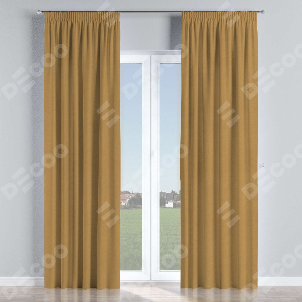 Комплект прямых штор, от производителя «Cortin», пошиты из ткани вельвет горчица, артикул ткани 17760. С изнаночной стороны в верхней части штор пристрачивается шторная лента с декоративными складками «Карандаш». Для создания элегантных складок прямые шторы шьются по стандарту с коэффициентом 1:2 (на 100 см. ширины проёма 200 см. ширины ткани).