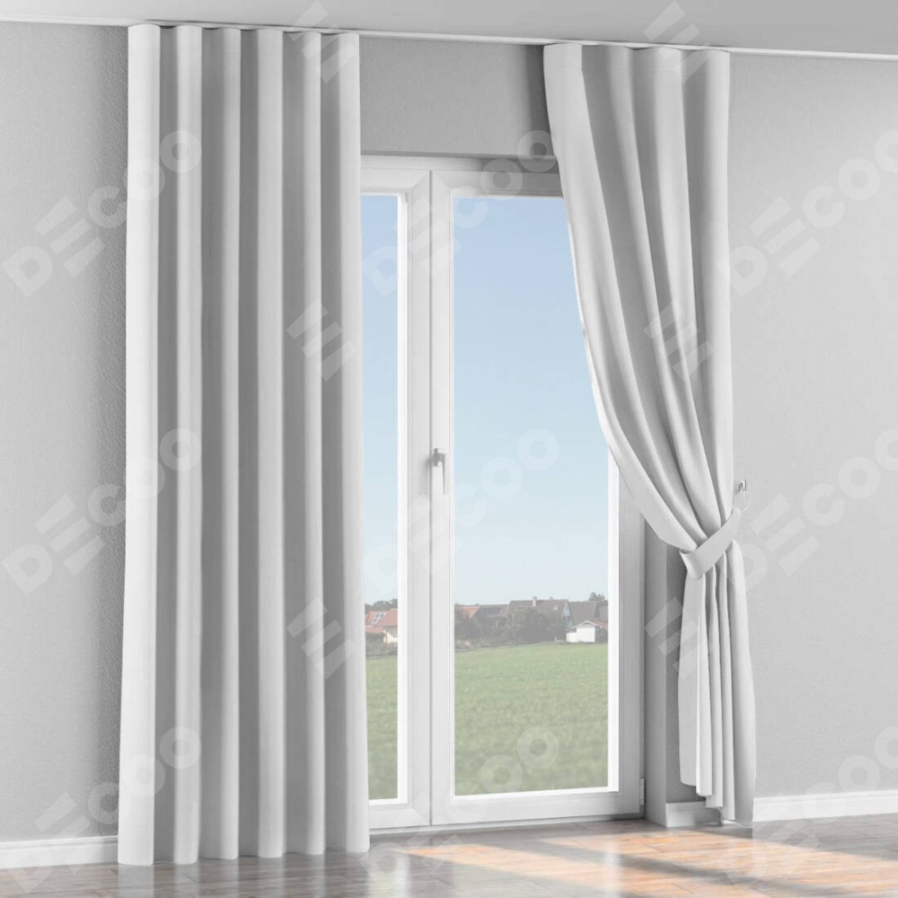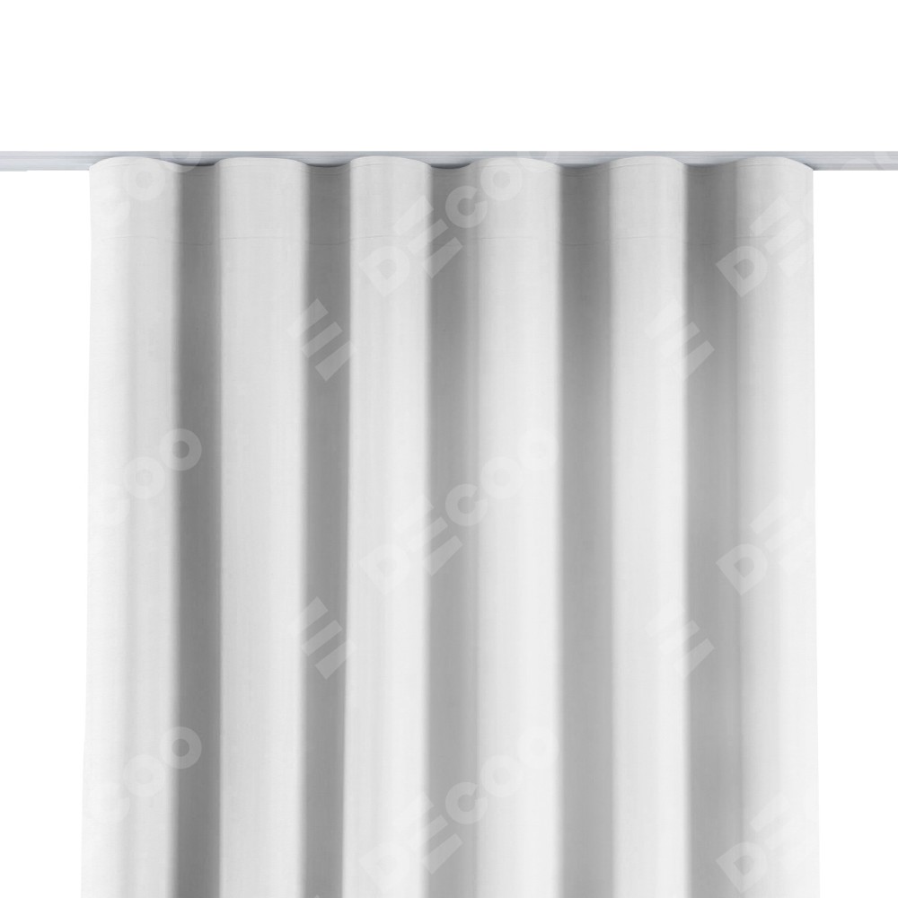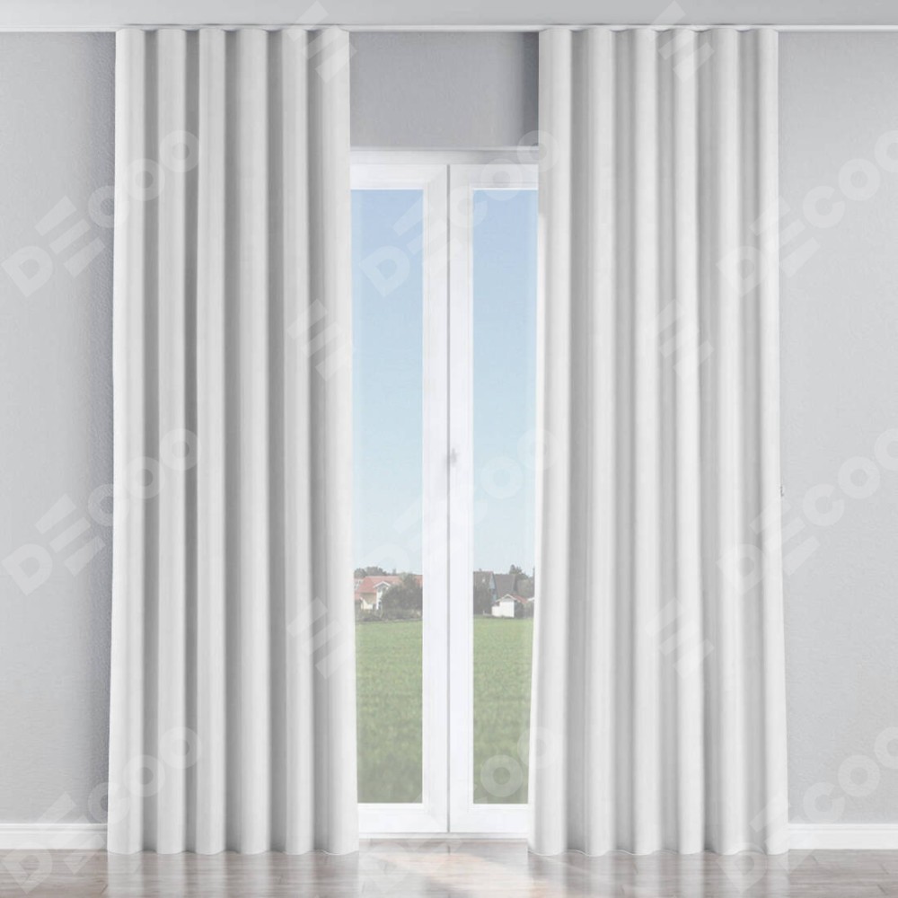 Комплект прямых штор, от производителя «Cortin», пошиты из ткани вельвет дымчато-белый, артикул ткани 85535. С изнаночной стороны в верхней части штор пристрачивается шторная лента с декоративными складками «Волна». Для создания элегантных складок прямые шторы шьются по стандарту с коэффициентом 1:2 (на 100 см. ширины проёма 200 см. ширины ткани).