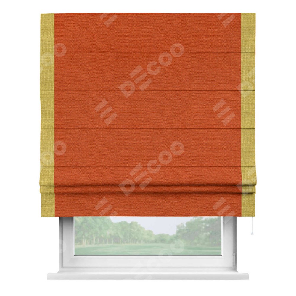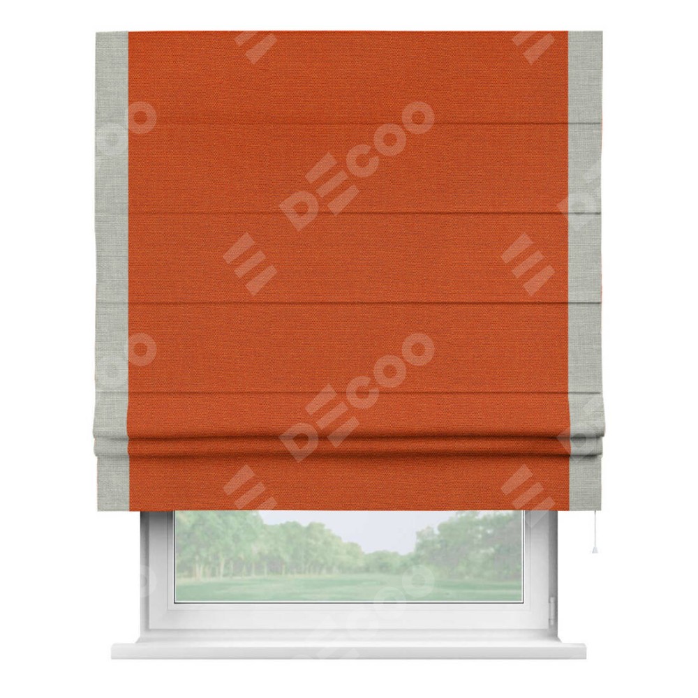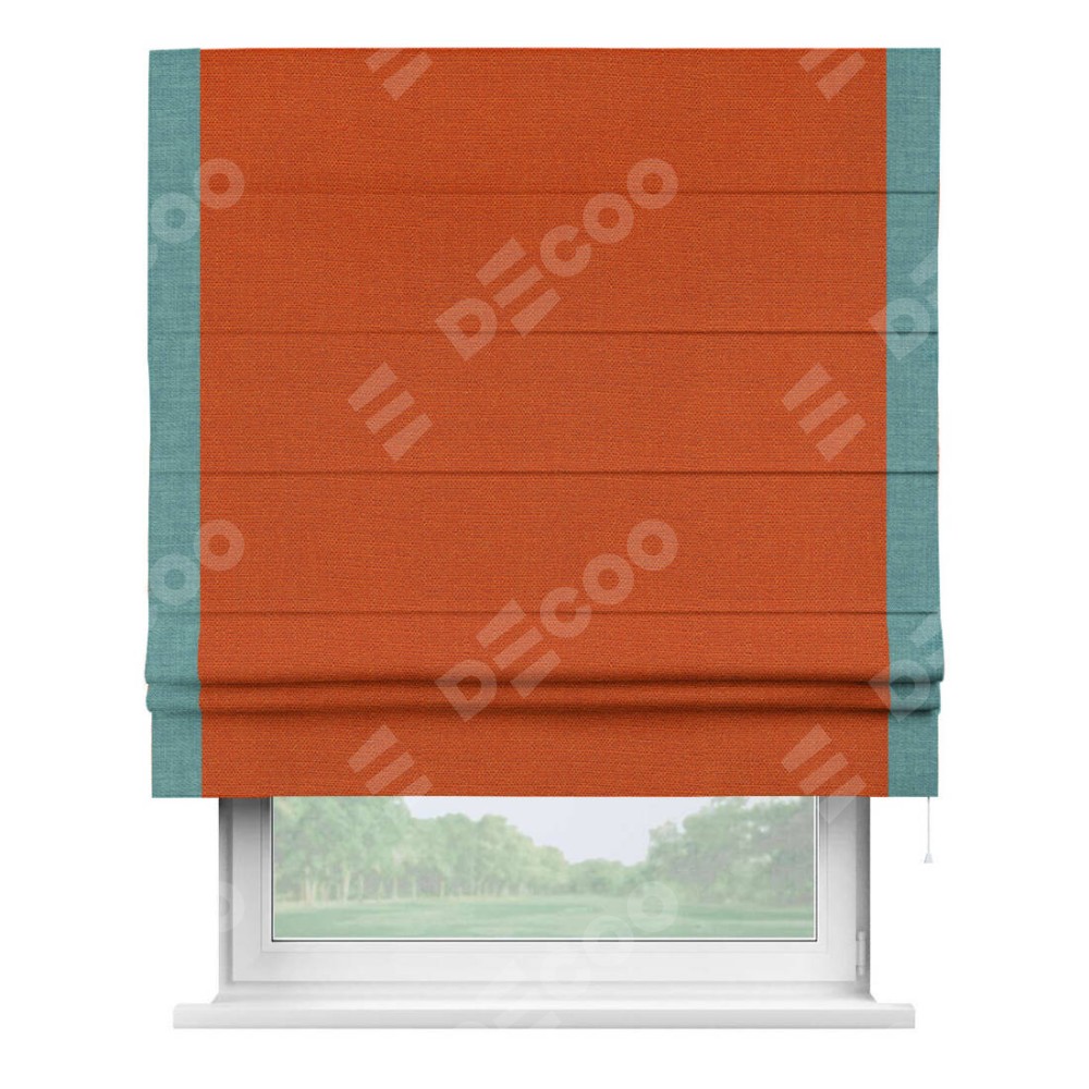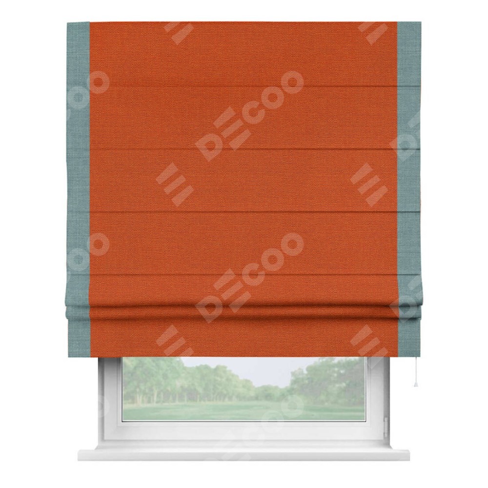 Римская штора производителя «Cortin», используется для проёма, пошита из ткани лён терракотовый, артикул 53440. Отделка шторы кантом «Стрим Дуо», ткань для канта используется из льна разной расцветки на выбор. Имеет универсальный механизм и подходит для монтажа: на потолок, на стену и в нишу.