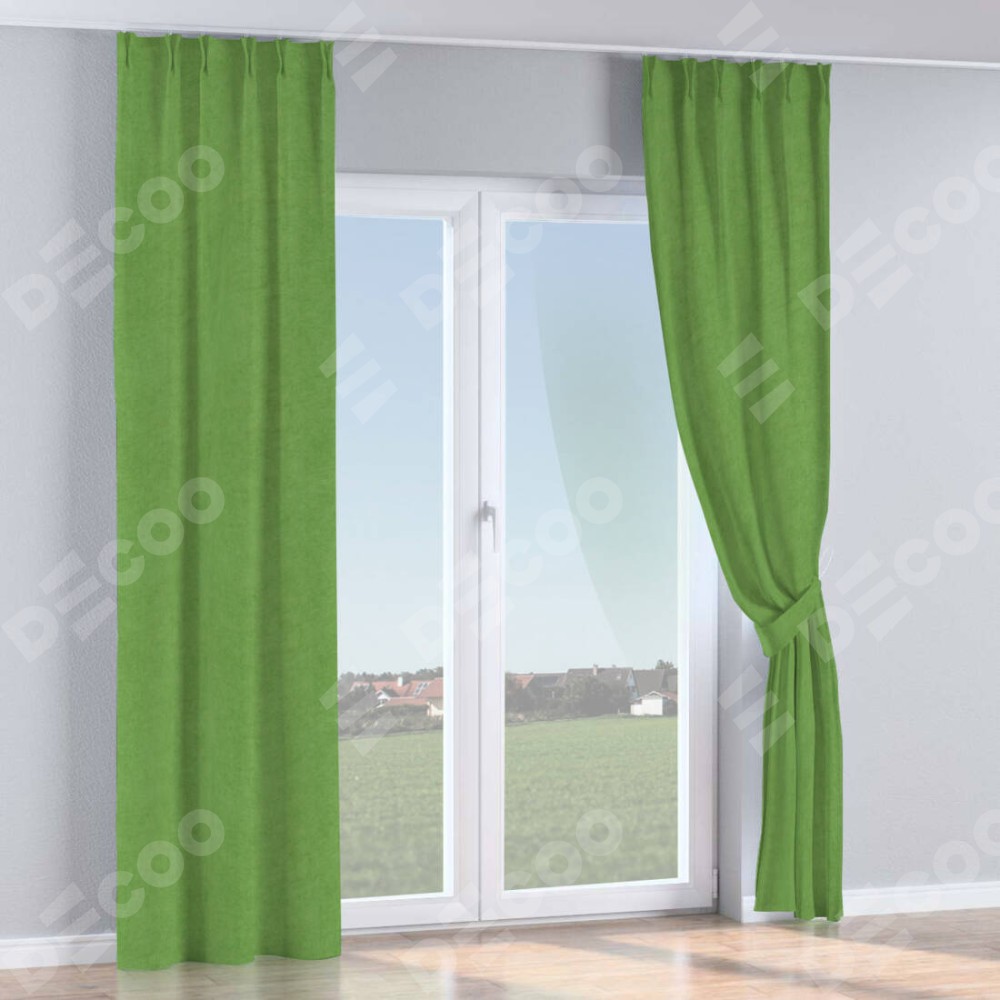 Комплект прямых штор, от производителя «Cortin», пошиты из ткани вельвет салатовый, артикул ткани 87072. С изнаночной стороны в верхней части штор пристрачивается шторная лента с декоративными складками «Кустик». Для создания элегантных складок прямые шторы шьются по стандарту с коэффициентом 1:2 (на 100 см. ширины проёма 200 см. ширины ткани).