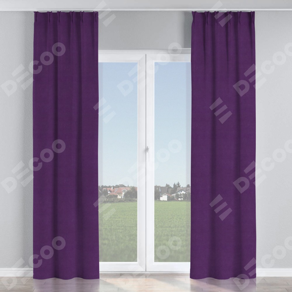 Комплект прямых штор, от производителя «Cortin», пошиты из ткани вельвет тёмно-фиолетовый, артикул ткани 17753. С изнаночной стороны в верхней части штор пристрачивается шторная лента с декоративными складками «Кустик». Для создания элегантных складок прямые шторы шьются по стандарту с коэффициентом 1:2 (на 100 см. ширины проёма 200 см. ширины ткани).