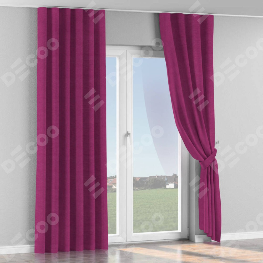 Комплект прямых штор, от производителя «Cortin», пошиты из ткани вельвет фиолетовый, артикул ткани 85552. С изнаночной стороны в верхней части штор пристрачивается шторная лента с декоративными складками «Волна». Для создания элегантных складок прямые шторы шьются по стандарту с коэффициентом 1:2 (на 100 см. ширины проёма 200 см. ширины ткани).