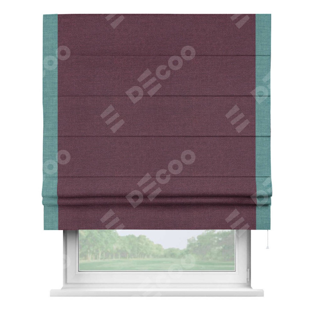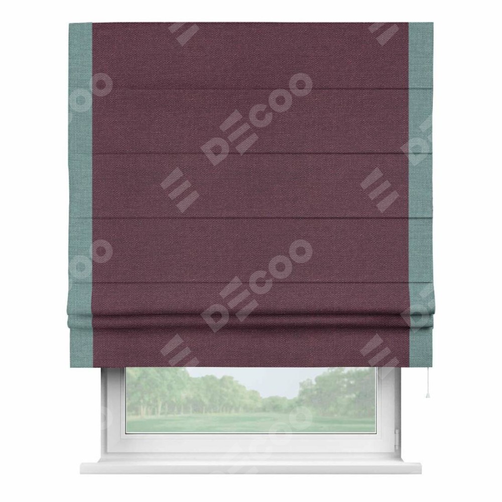 Римская штора производителя «Cortin», используется для проёма, пошита из ткани лён фиолетовый, артикул 85907. Отделка шторы кантом «Стрим Дуо», ткань для канта используется из льна разной расцветки на выбор. Имеет универсальный механизм и подходит для монтажа: на потолок, на стену и в нишу.