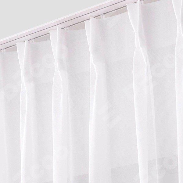 Комплект прямых штор, от производителя «Cortin», пошиты из ткани тюль белый, артикул ткани V-01. С изнаночной стороны в верхней части штор пристрачивается шторная лента с декоративными складками «Кустик». Для создания элегантных складок прямые шторы шьются по стандарту с коэффициентом 1:2 (на 100 см. ширины проёма 200 см. ширины ткани).