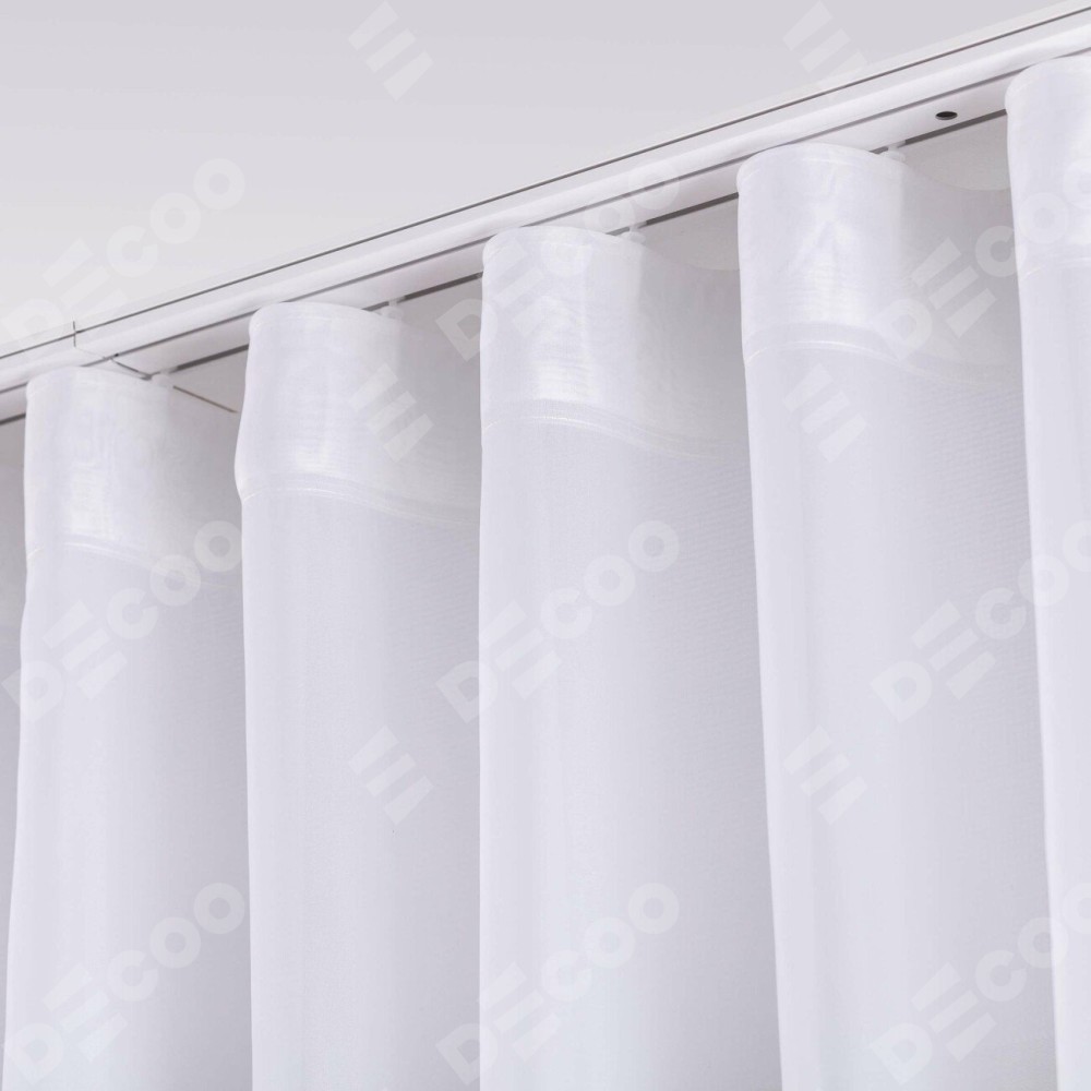 Комплект прямых штор, от производителя «Cortin», пошиты из ткани тюль белый, артикул ткани V-01. С изнаночной стороны в верхней части штор пристрачивается шторная лента с декоративными складками «Волна». Для создания элегантных складок прямые шторы шьются по стандарту с коэффициентом 1:2 (на 100 см. ширины проёма 200 см. ширины ткани).